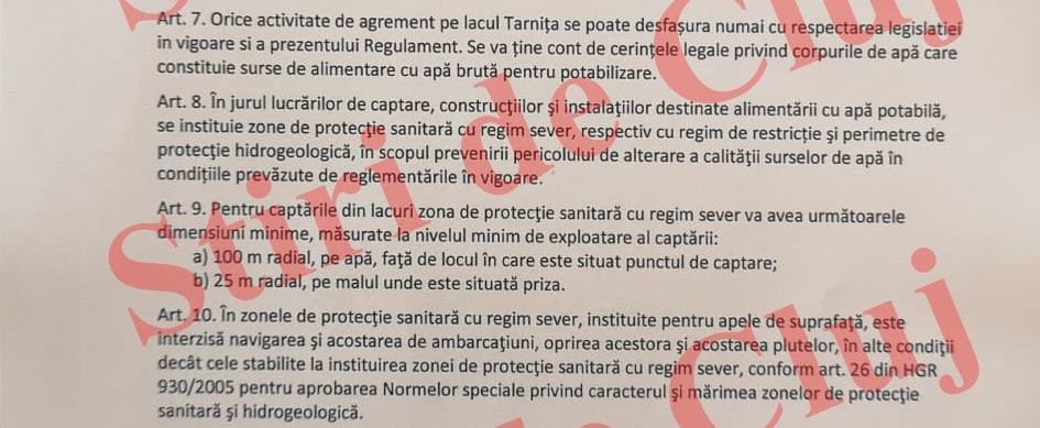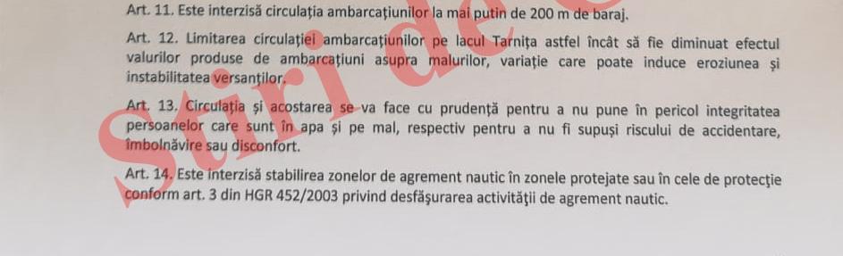 - Pe lacul Tarnița să poată circula numai ambarcațiunile cu motor aparținând instituțiilor statului care au drept de inspecție și control pe lacul Tarnița și ambarcațiunile de intervenție în caz de situații de urgență/accident.