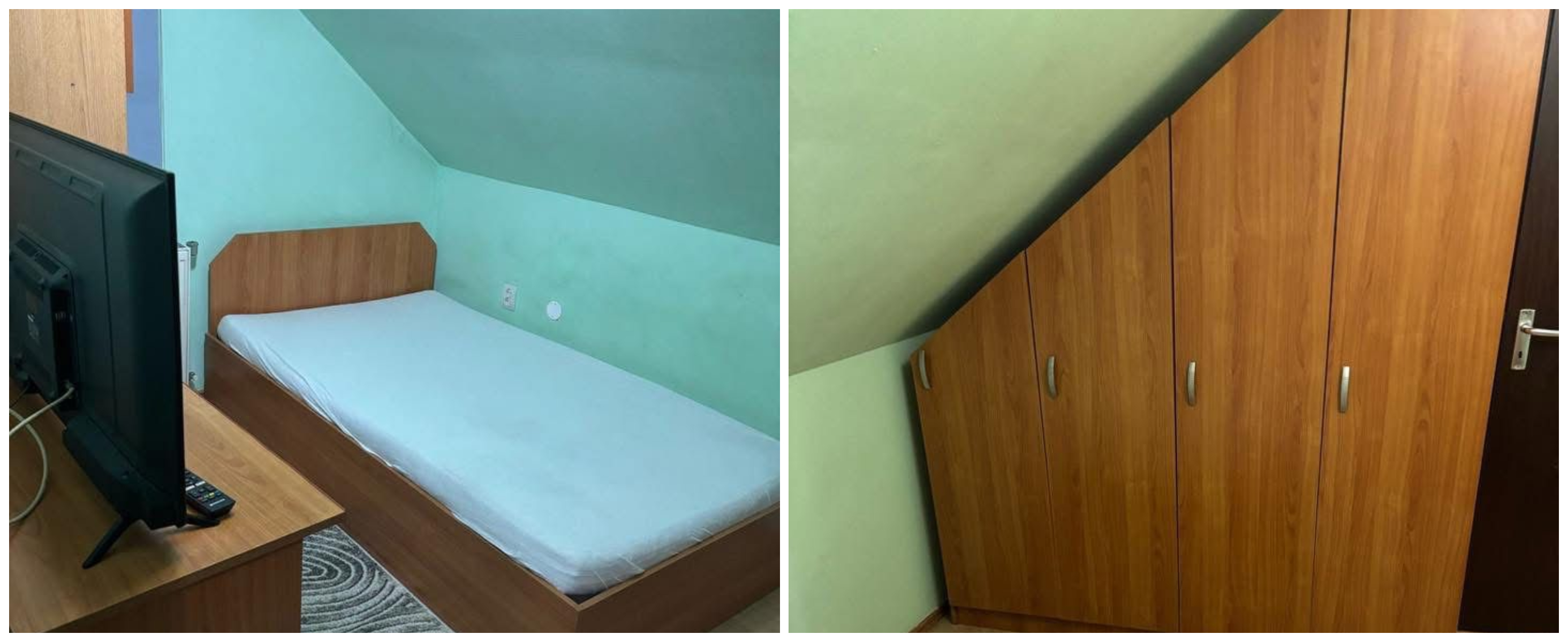 Prima cameră îți întâmpină privirea cu un verde „șters” pe pereți, semn că acea cameră nu a fost renovată de foarte mult timp. Baia, în schimb, pare gândită pentru cineva care știe exact cum să se întoarcă pe loc fără să-și lovească coatele, iar fiecare centimetru pătrat contează.