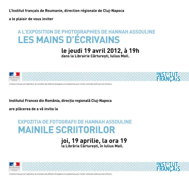 Expozitia de fotografie "Les Mains D'ecrivains/Mainile scriitorilor" va fi vernisata joi, 19 aprilie, la Cluj-Napoca, la libraria Carturesti din Iulius Mall.