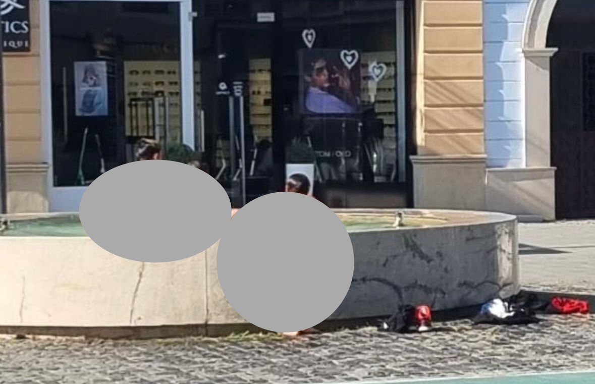 Mai mulți copii au profitat de temperaturile încă ridicate de afară pentru a merge la scăldat. Nu au ales însă vreun ștrand sau piscină ci au optat pentru fântâna arteziană de pe Bulevardul Eroilor.