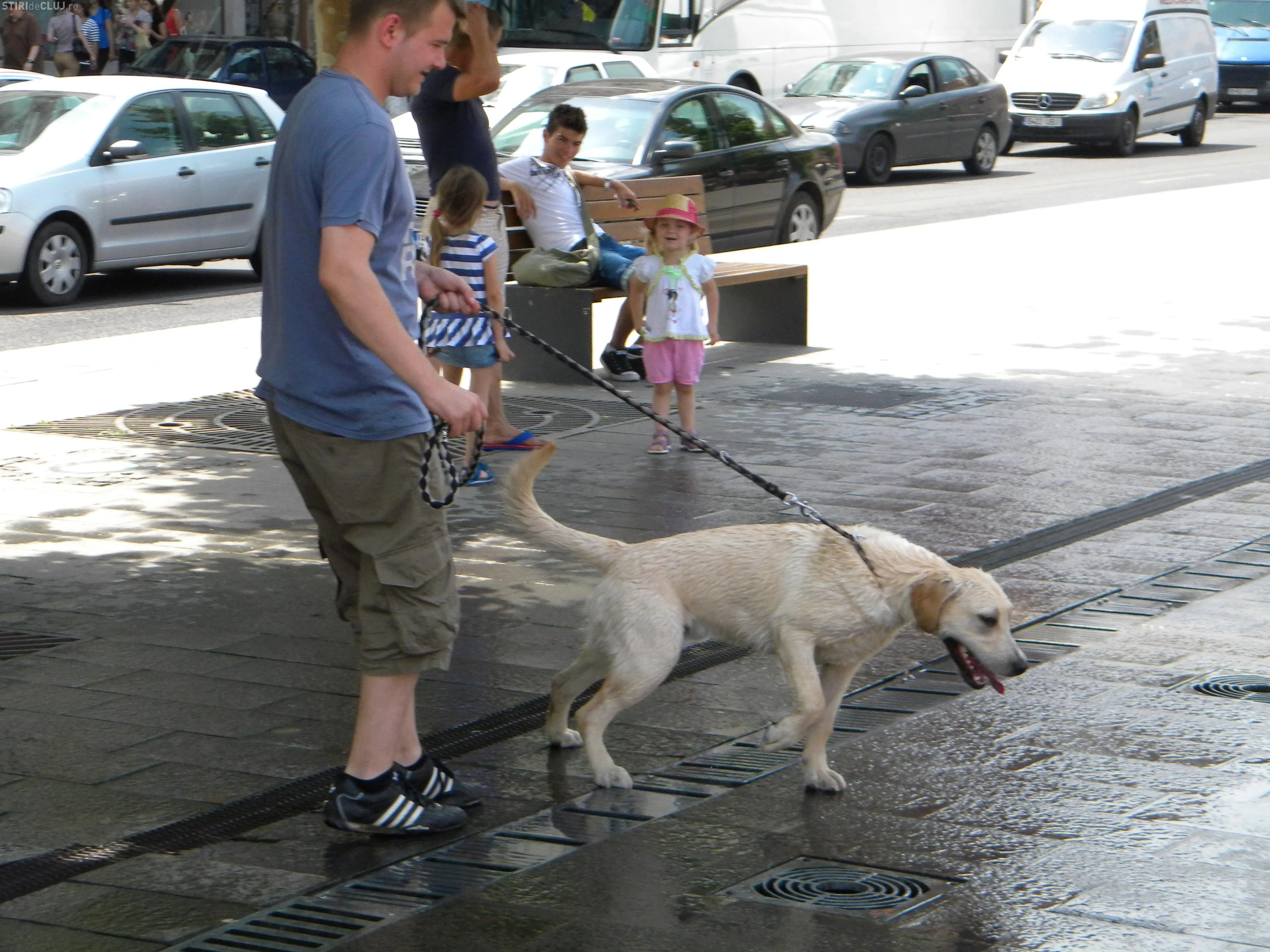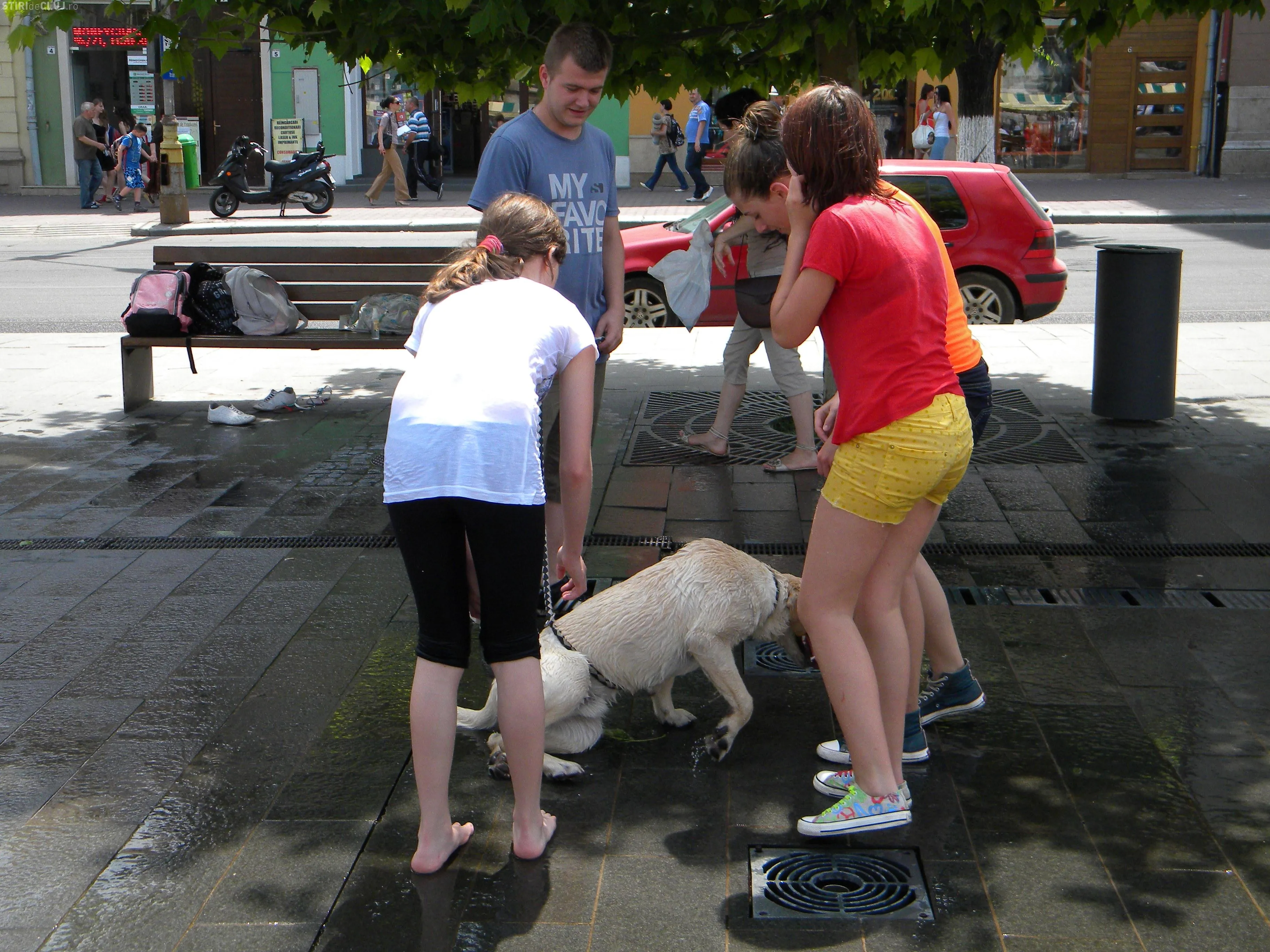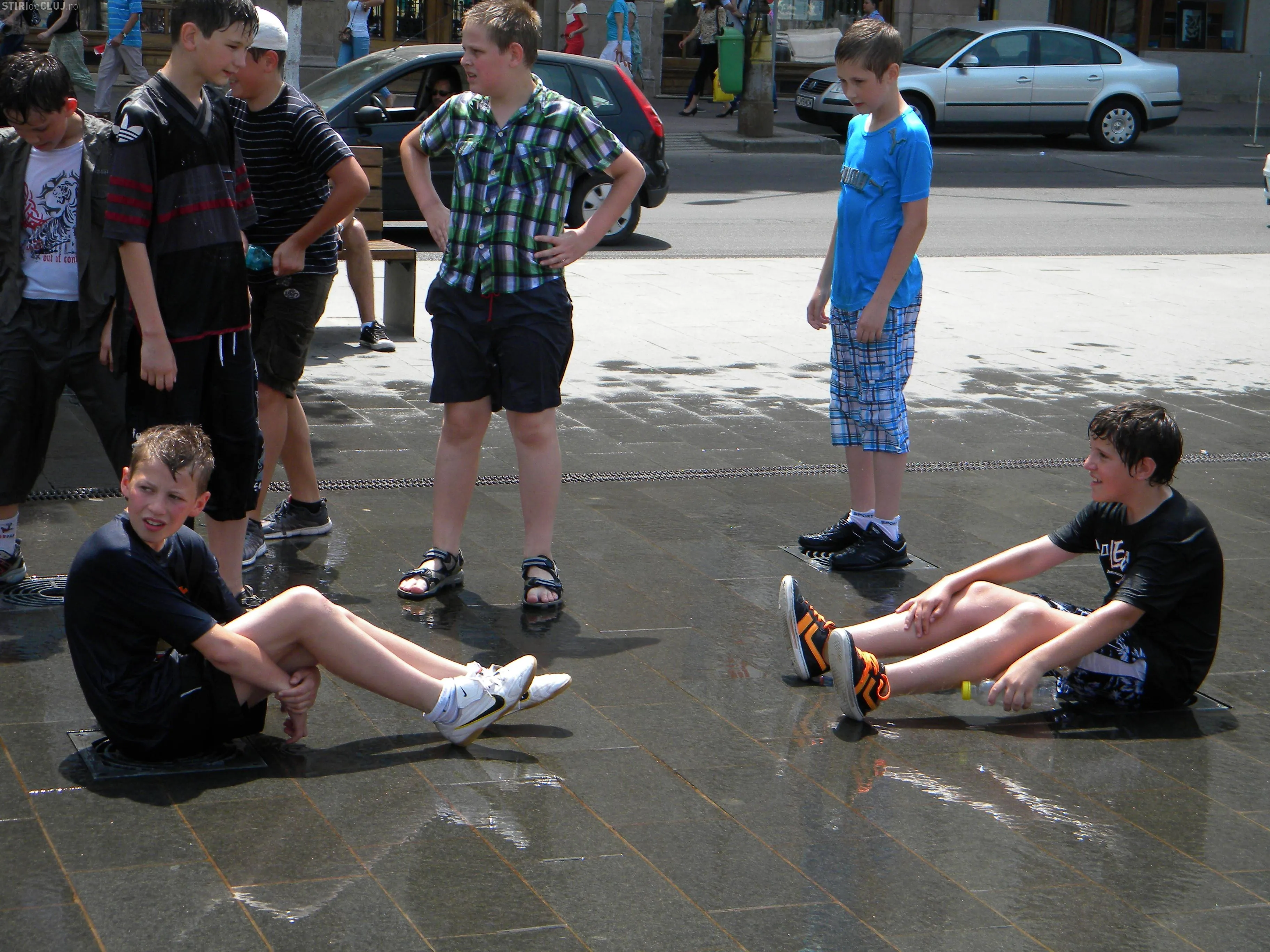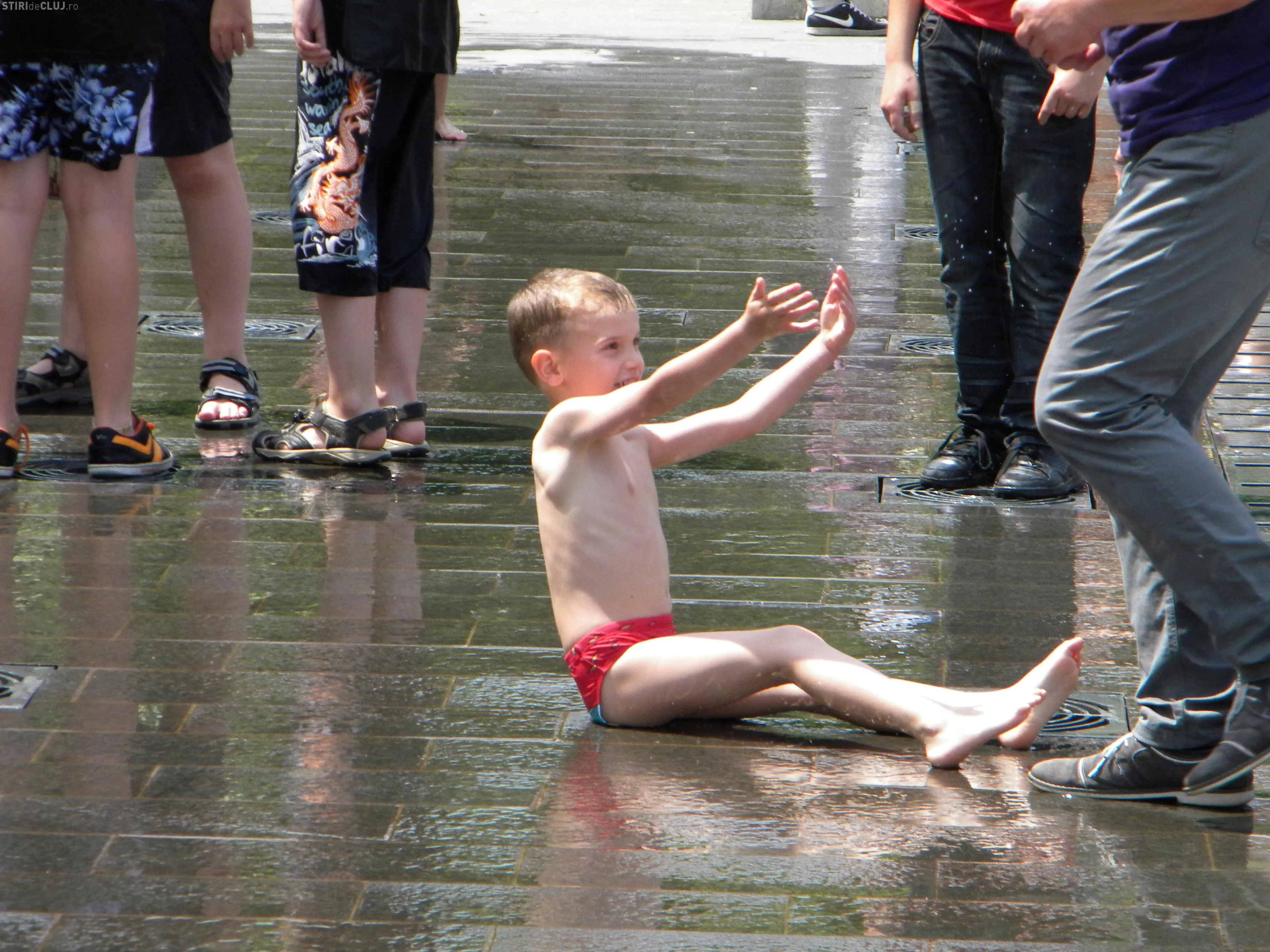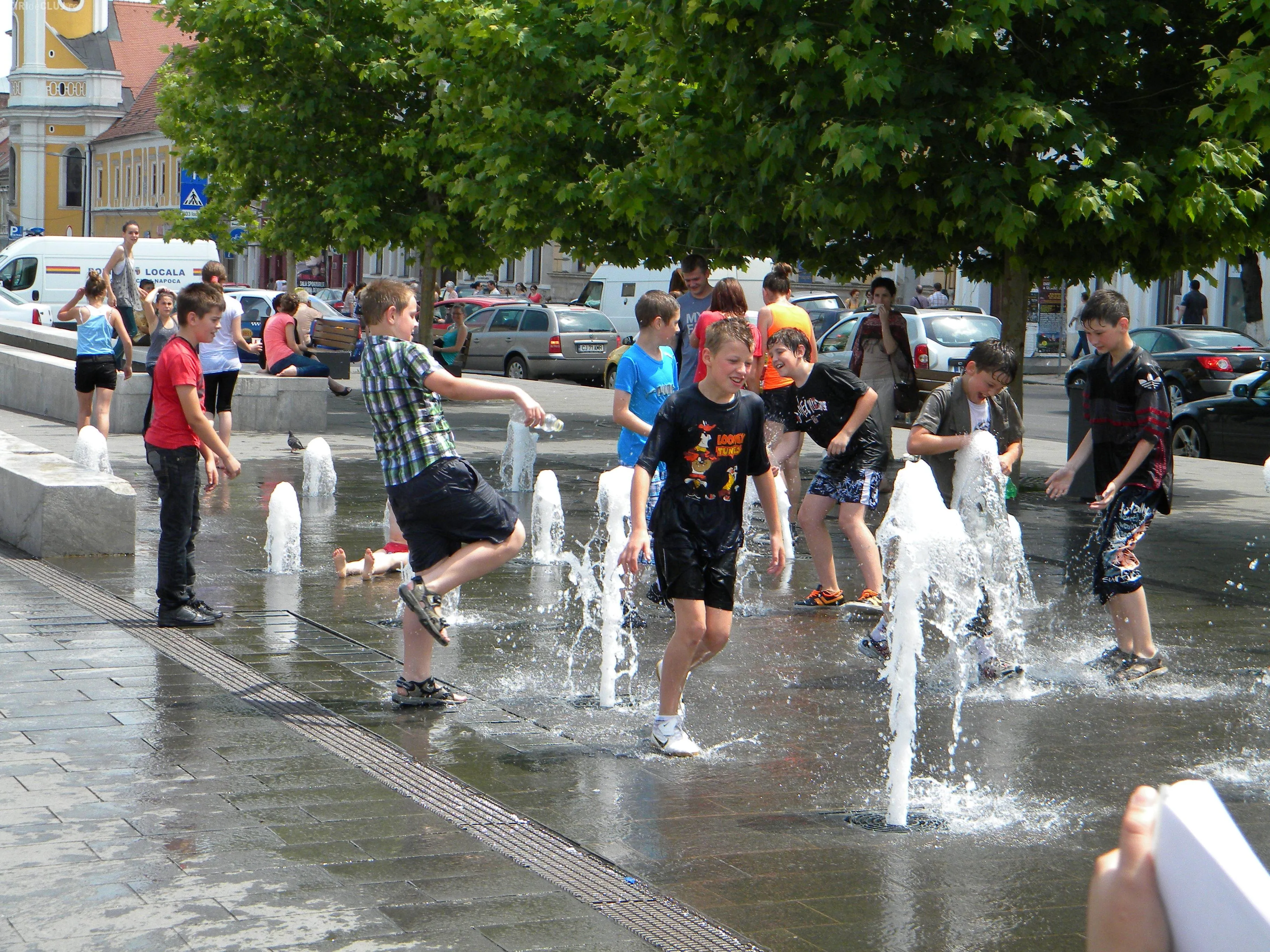 Fântâna arteziană din Piața Unirii a fost luată cu asalt de copii, miercuri, 19 iunie, la orele amiezii.