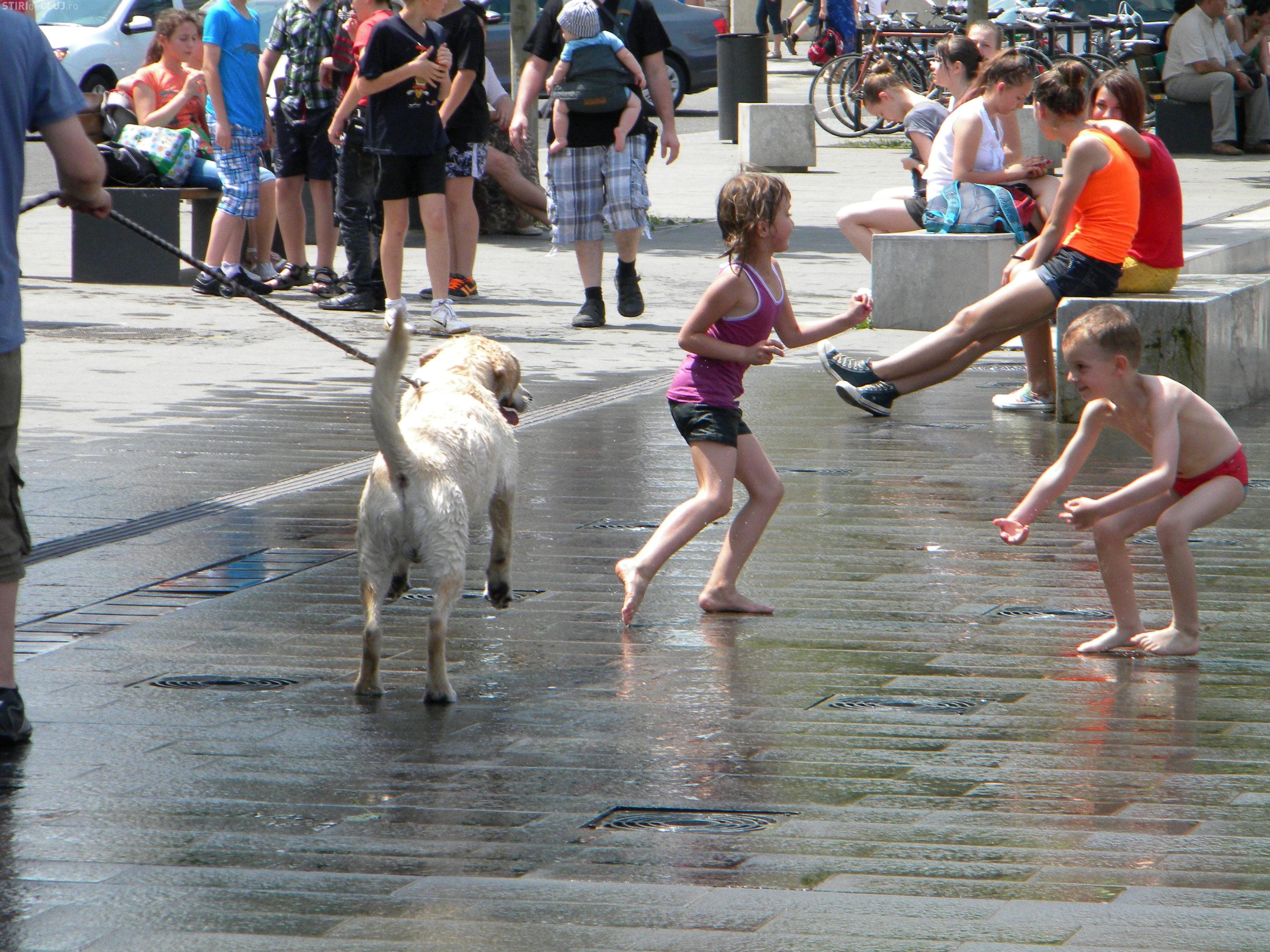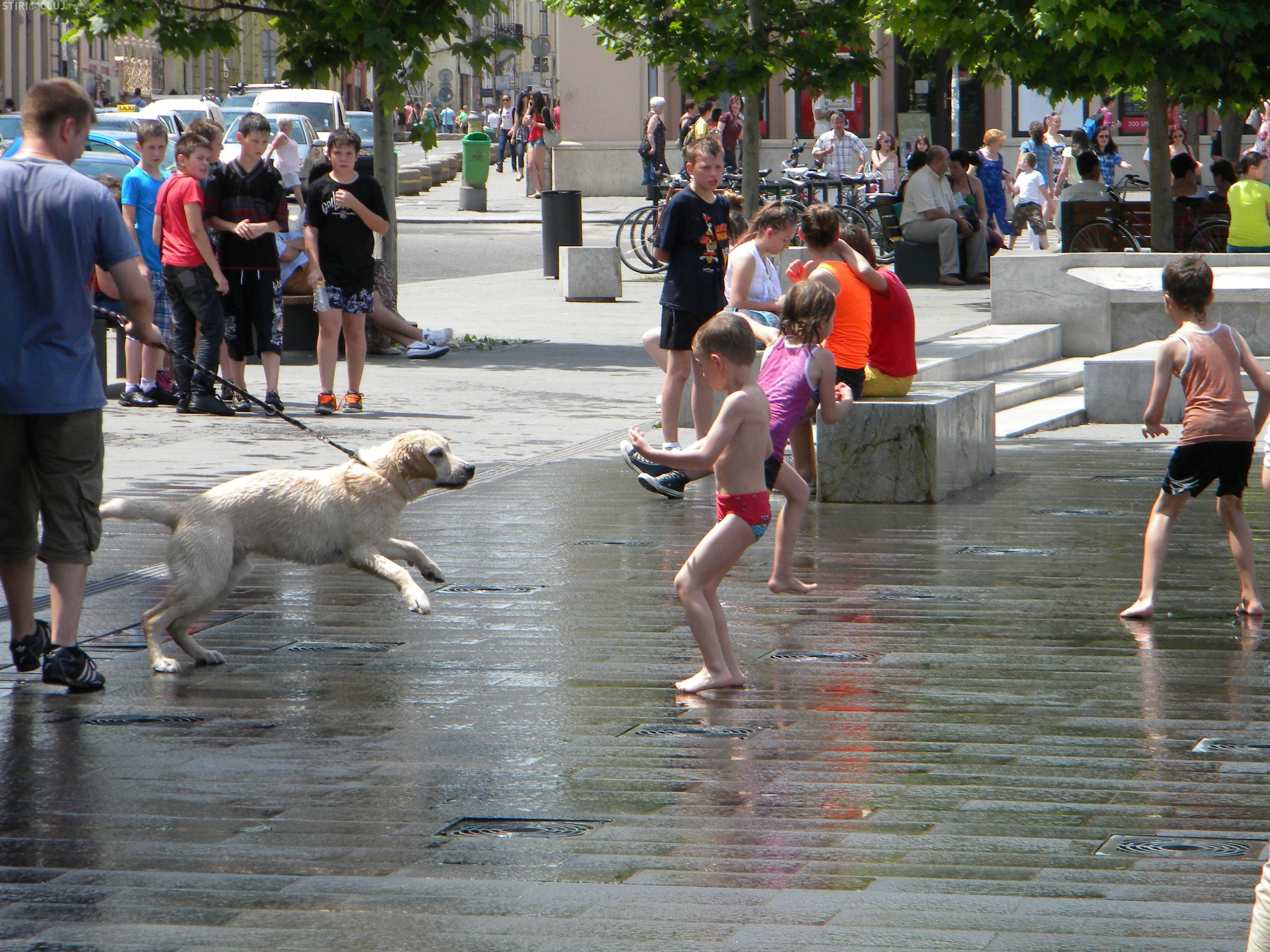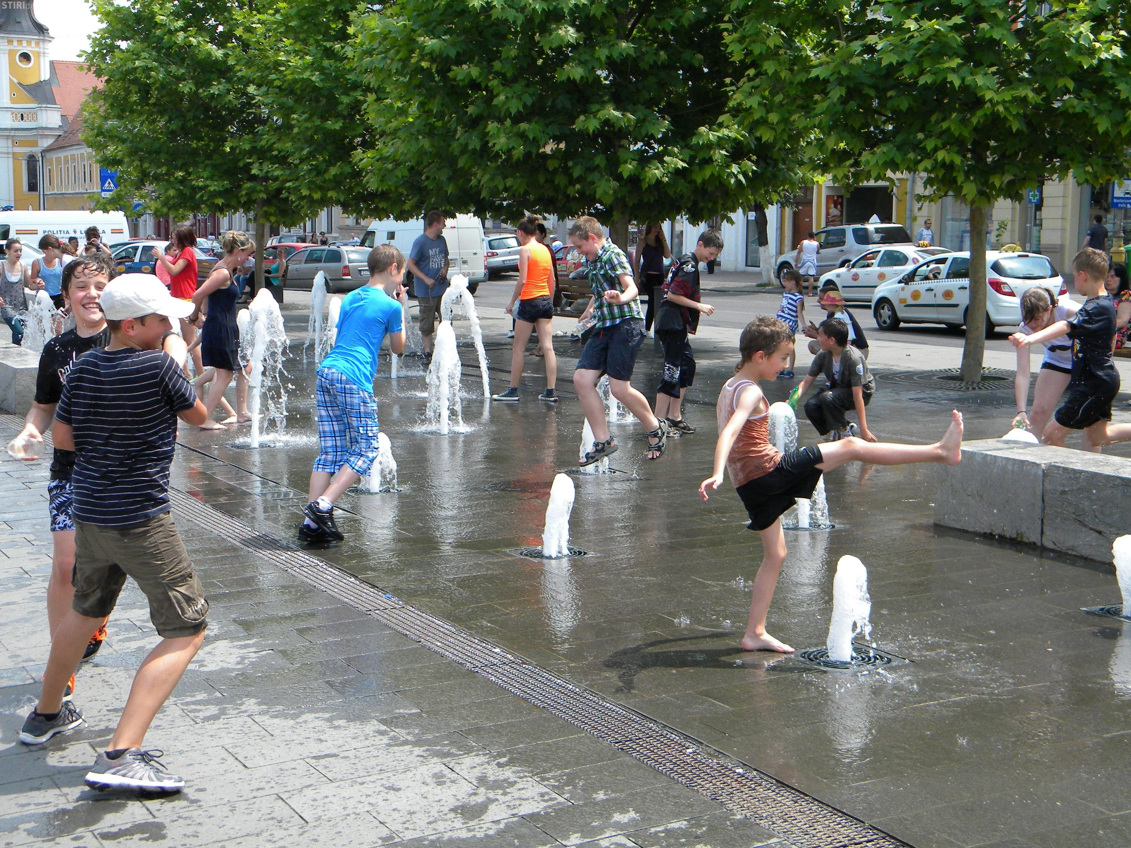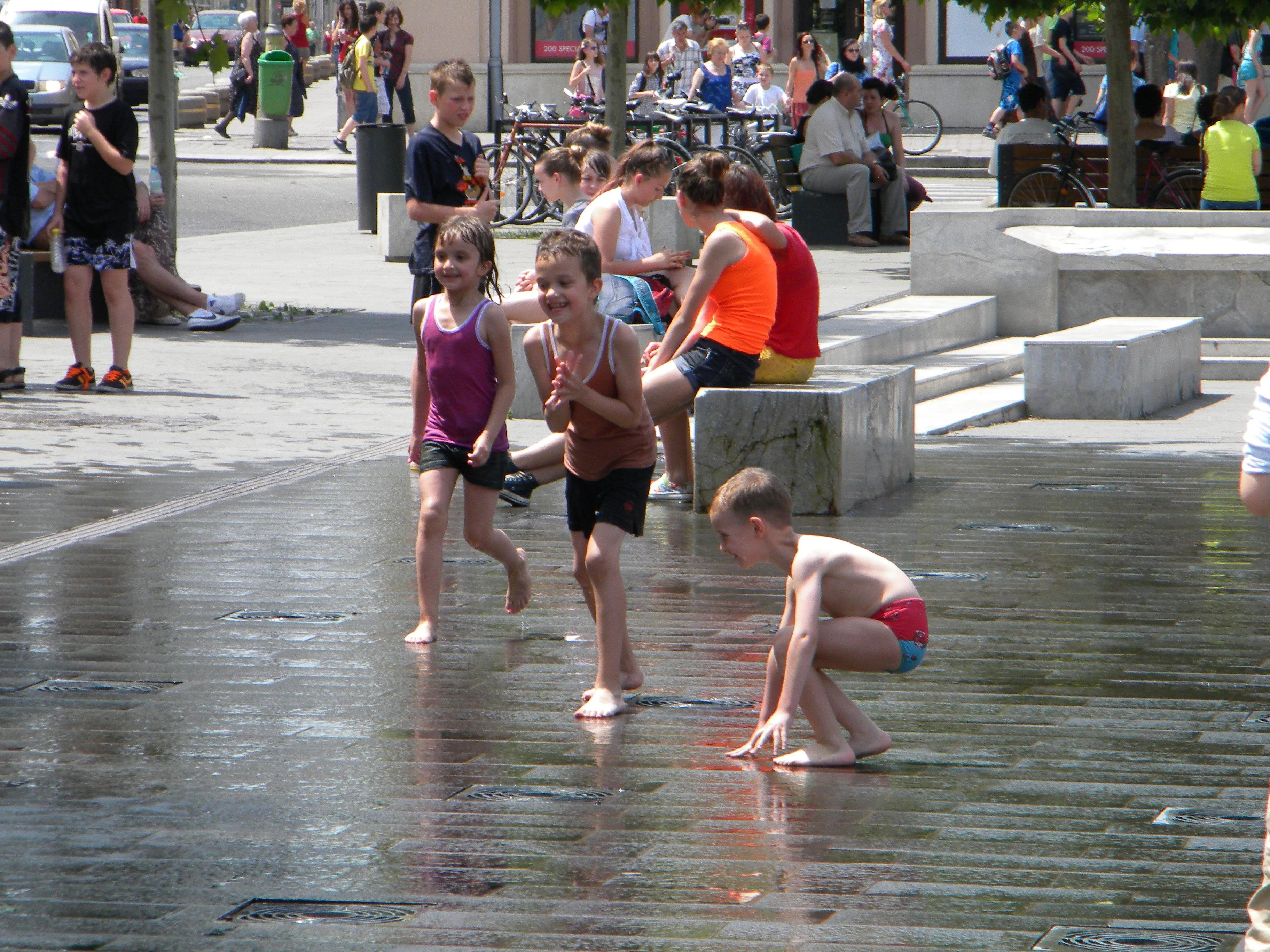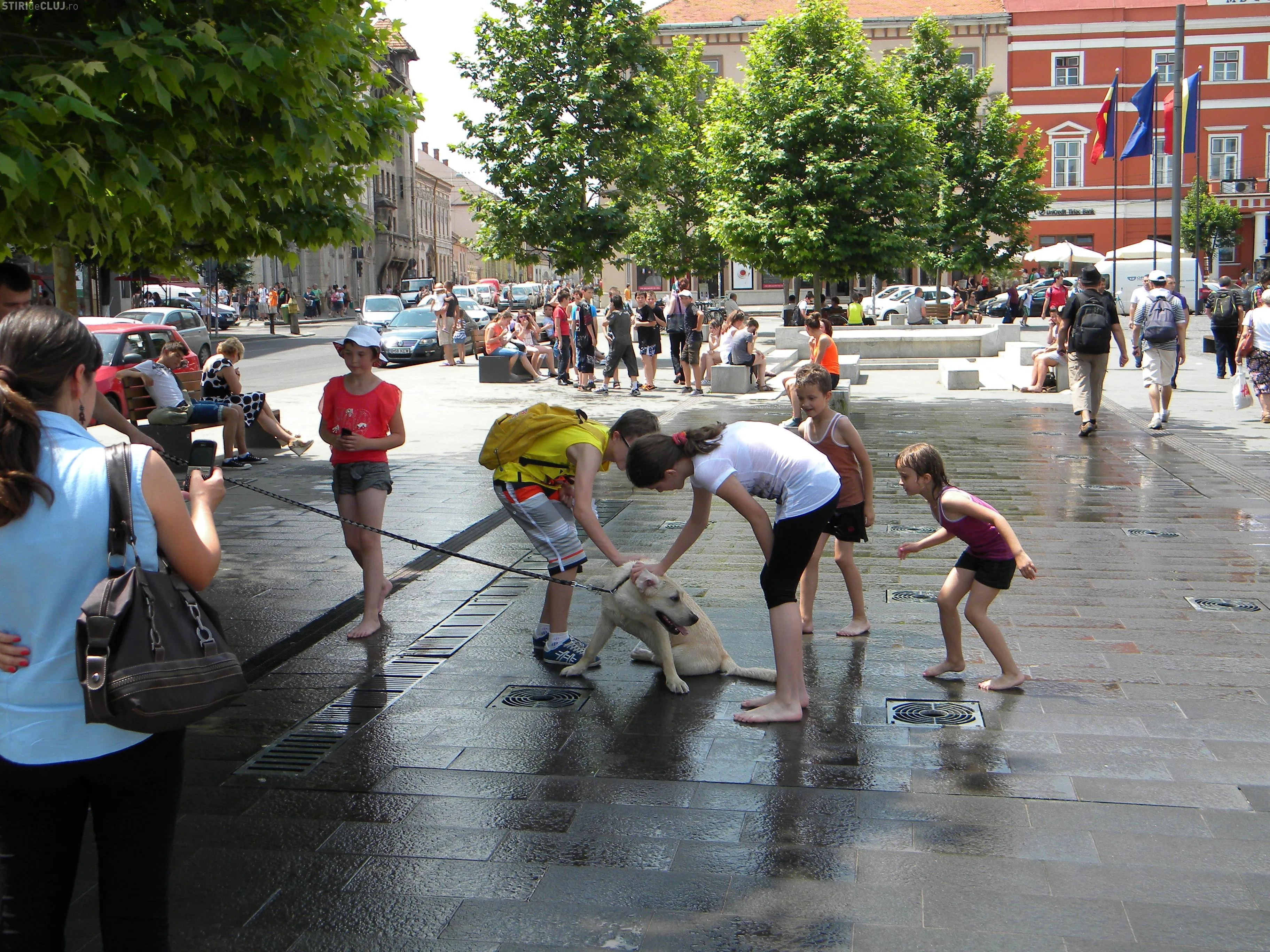 Fântâna arteziană din Piața Unirii, luată cu asalt de copii - FOTO