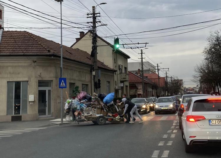”Doi șoferi au coborât de la volan ca să dea o mână de ajutor tipului cu cartoane să treacă strada”, a relatat un șofer clujean pe grupul Info Trafic Cluj-Napoca.