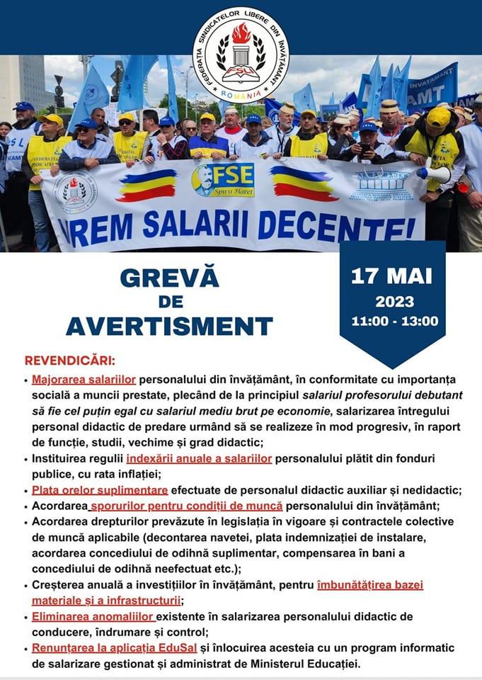 ”La orele 20:00 s-a încheiat ședința Colegiului Național al Liderilor FSLI. S-au centralizat rezultatele referendumului și avem 71% dintre colegi care au semnat pentru greva generală la nivel național. Ca atare, votul FSLI este că din 22 mai, orele 8:00 începe GREVA GENERALĂ. Pentru aceasta, conform legii, trebuie parcursă și greva de avertisment. S-a votat ca miercuri, 17 mai, în intervalul 11,00-13,00 să se deruleze greva de avertisment. Repet, fără greva de avertisment nu se poate declanșa greva generală. Aceleași decizii le-au luat și cei de la Spiru Haret. La greva de avertisment vom sta cu copiii în clasă și îi supraveghem. La greva generală, începând de luni, 22 mai, anunțam părinții să nu își aducă la scoală/grădiniță/creșă copiii pentru că SUNTEM ÎN GREVA GENERALĂ, ADICĂ INCETĂM LUCRUL. Dacă cineva vă spune că nu puteți face grevă pentru că le încălcați drepturile elevilor, nu face altceva decât să vă intimideze. Nu cădeți în această capcană! De la mitingul din 10 mai, când au ieșit în Piața 15000 de salariați din învățământ, niciun reprezentant al Guvernului nu a discutat cu noi despre problemele noastre”, spune un cadru didactic.