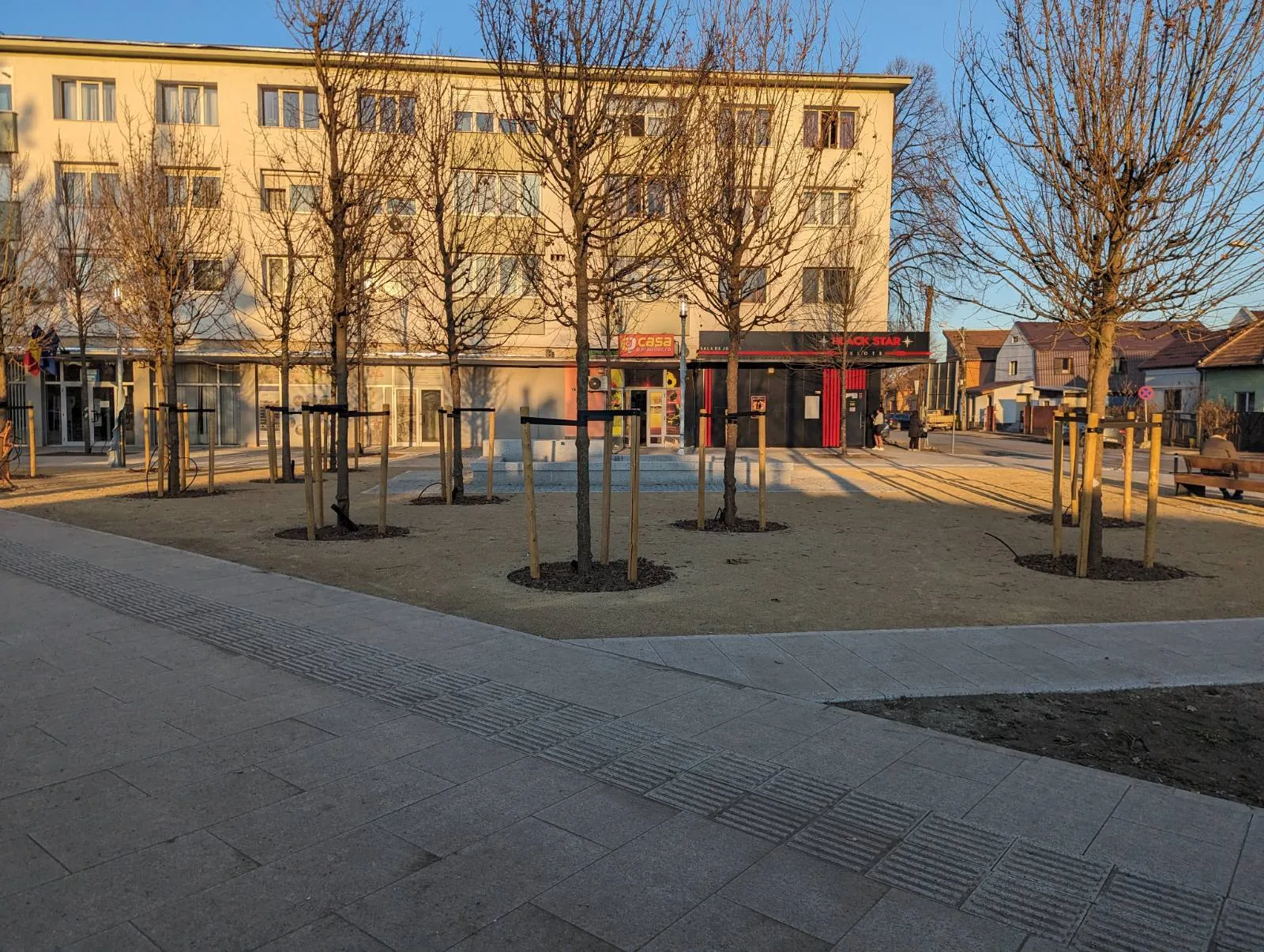 Înainte de demararea lucrărilor, în acest spațiu era amenajată o parcare, care acum a fost eliminată complet. Totuși, în timp ce în locul mașinilor au apărut copaci și bănci pentru pietoni, iarba lipsește.