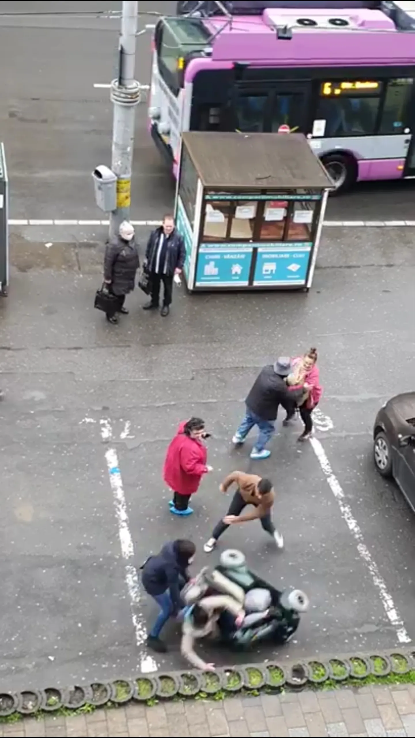 În imagini se vad mai multe persoane care o lovesc pe femeia cu handicap, iar la final un tânăr îi răstoarnă scaunul cu rotile și fuge la o mașină parcată. Autoturismul a demarat, iar trecatorii au ajutat-o pe femeia bătută.