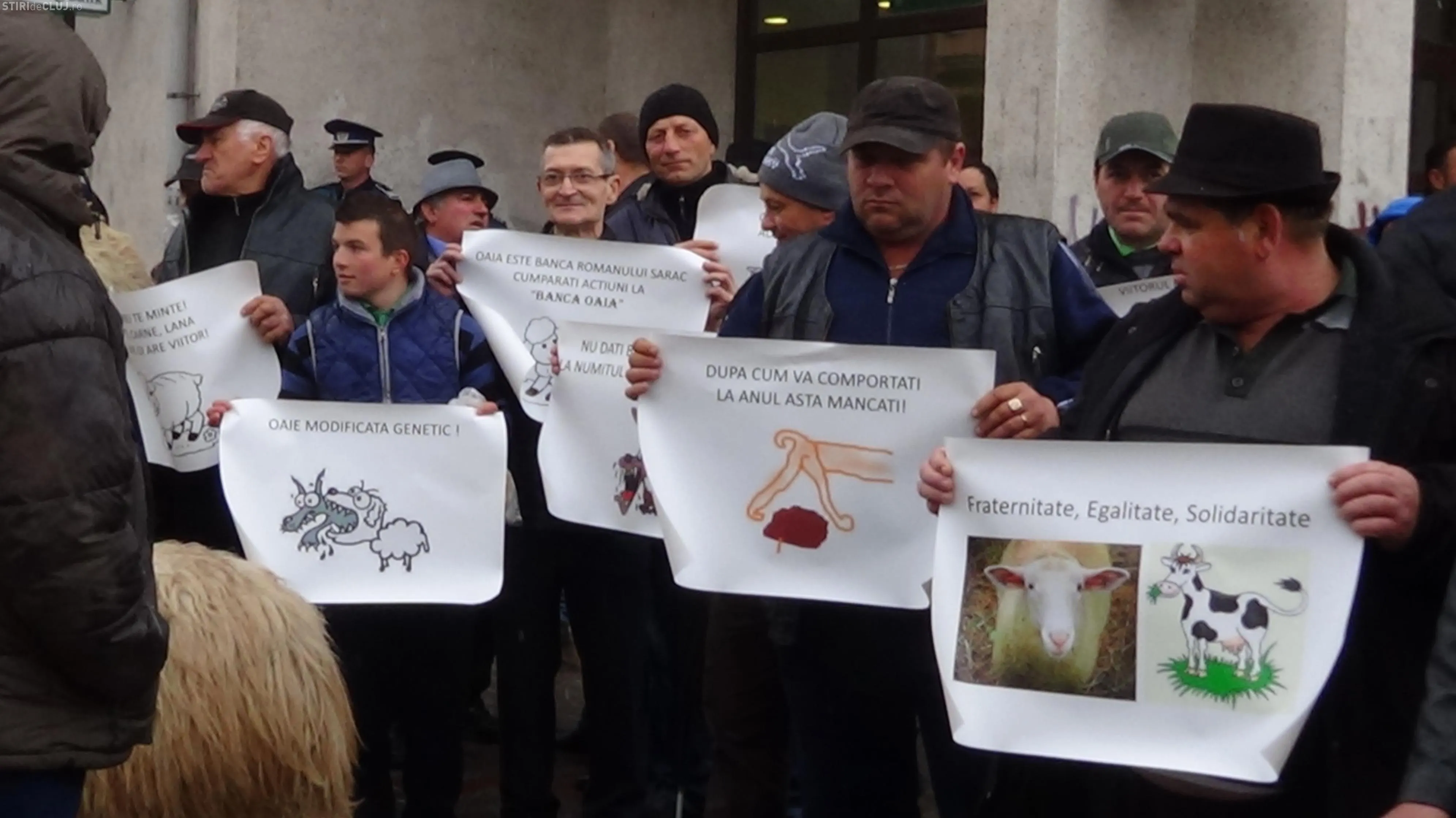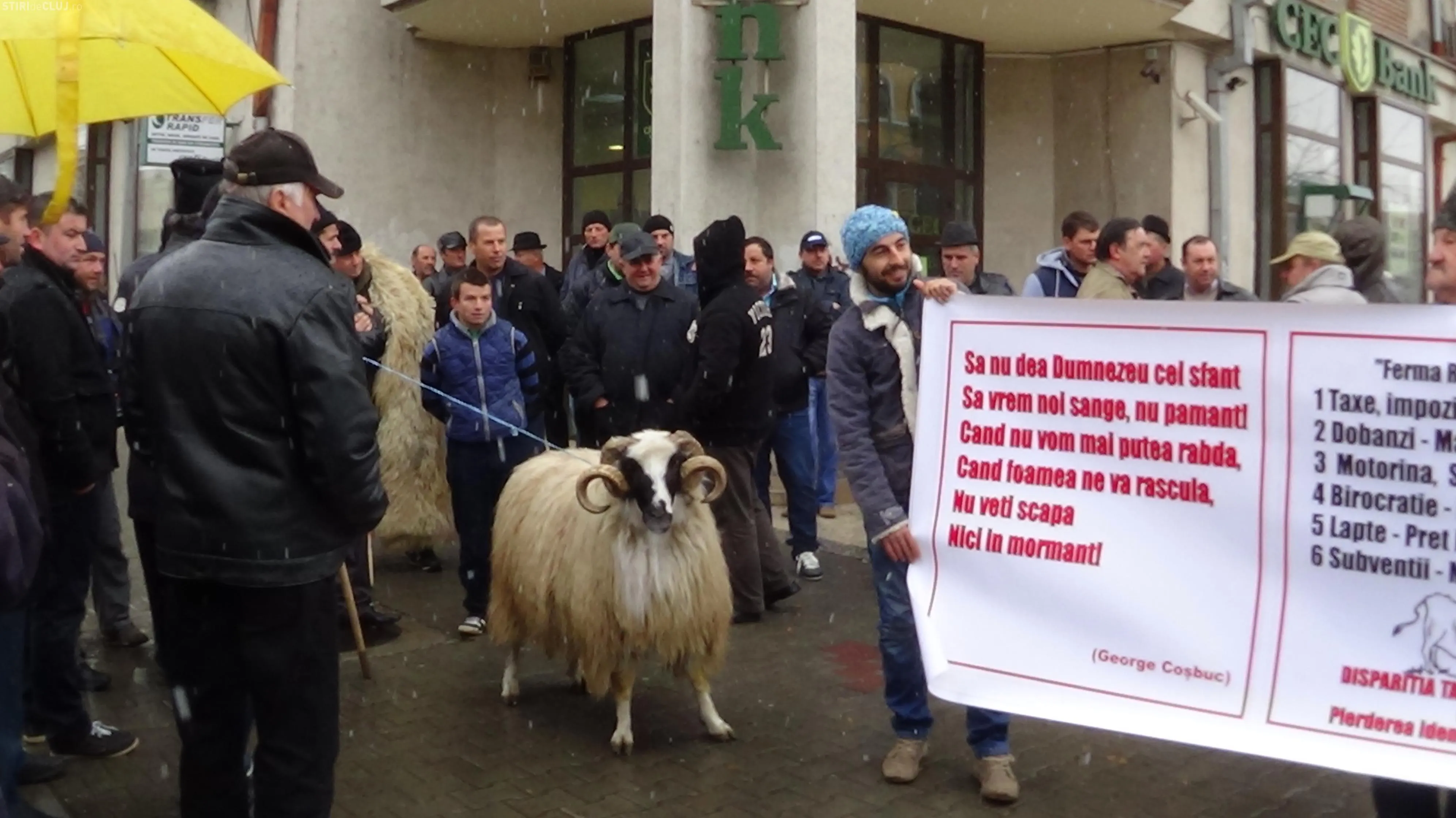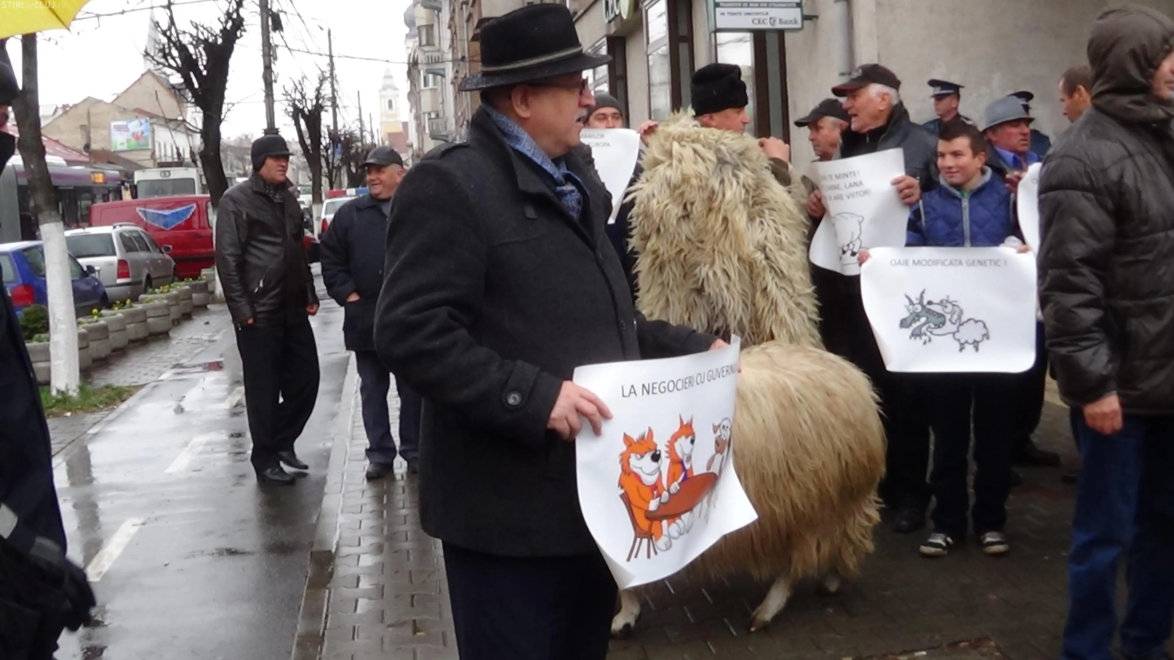 Fermierii clujeni protestează în fața Prefecturii. Vedeta manifestării a fost berbecul Daniel FOTO VIDEO