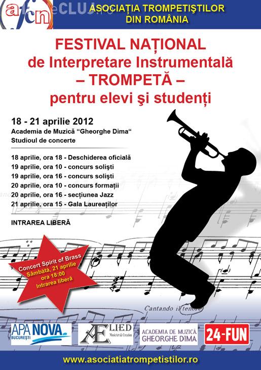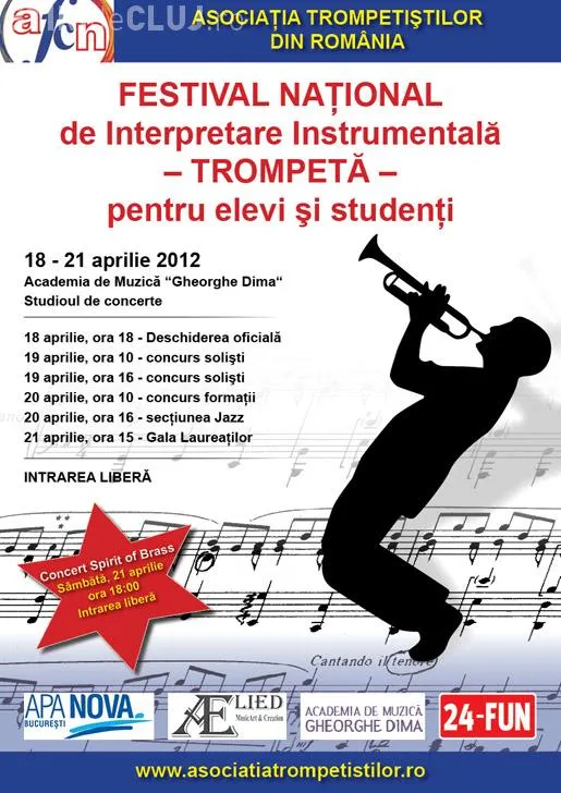 Festivalul National de Interpretare Instrumentala - Trompeta - Pentru Elevi si Studenti va avea deschiderea oficiala maine, 18 aprilie, de la ora 18:00, la Academia de Muzica Gheorghe Dima din Cluj-Napoca in studioul de concerte.