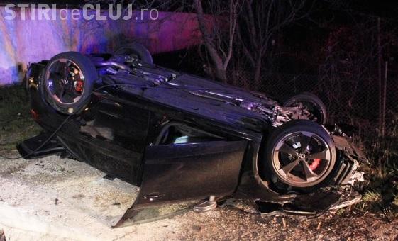 Soferul unui autoturism sport AUDI RS4 s-a rostogolit cu masina dupa ce un TIR i-ar fi iesit in fata. Soferul a tras dreapta de volan, a iesit de pe sosea, dupa care a rupt un stalp de lemn si s-a lovit de un podet. In urma impactului cu podetul masina s-a dat peste cap si a aterizat pe plafon.