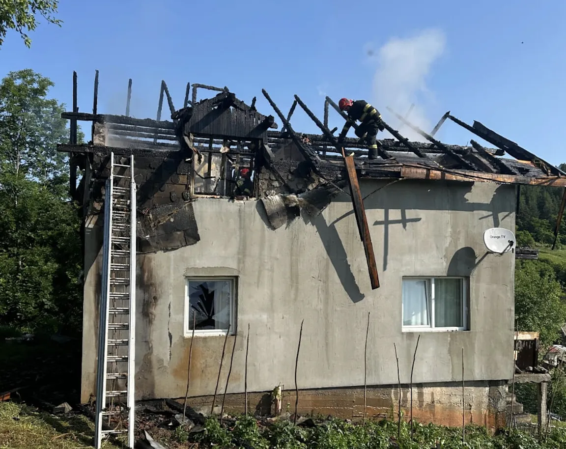 Echipajele operative au găsit acoperișul și primul etaj al casei cuprinse în totalitate de flăcări.