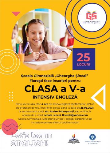 Şcoala Gimnazială “Ghe. Şincai” Floreşti face ȋnscrieri pentru Clasa a V-a INTENSIV ENGLEZA. Elevii vor studia câte 4 ore de limba engleză săptămânal, alături de nişte profesori de top. Ȋnscrierile se fac până la data de 25.06.2021 la secretariatul şcolii, str. Andrei Mureşanu nr. 1 sau online la adresa de e-mail: scoala_sincai_floresti@yahoo.com”, a anunțat primarul comunei, Bogdan Pivariu.
