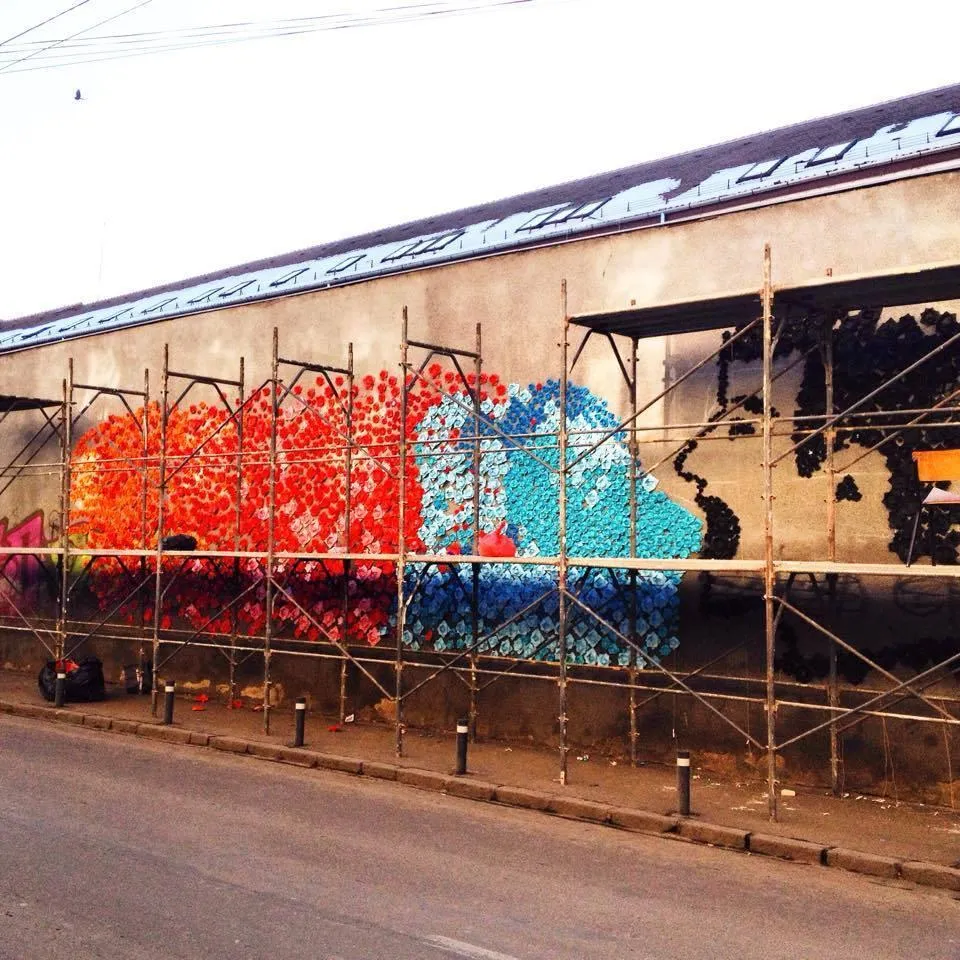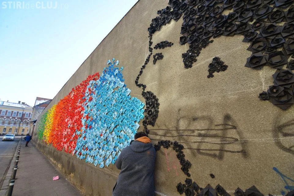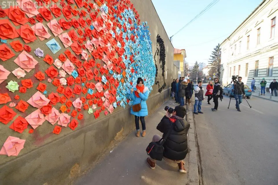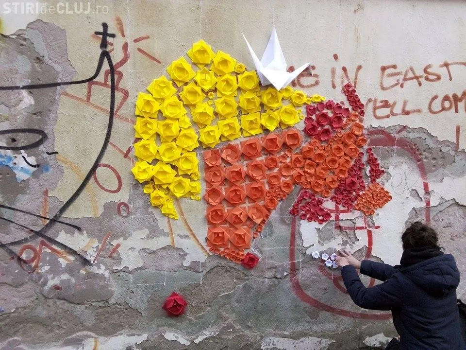 Flori de lotus din hârtie lipite pe trei ziduri din Cluj-Napoca. Este un proiect din cadrul Capitalei Europene a Tineretului