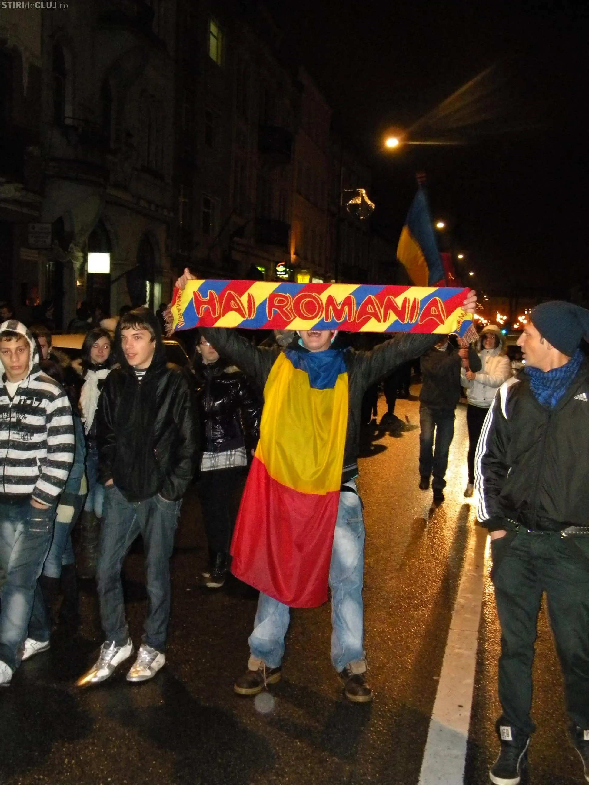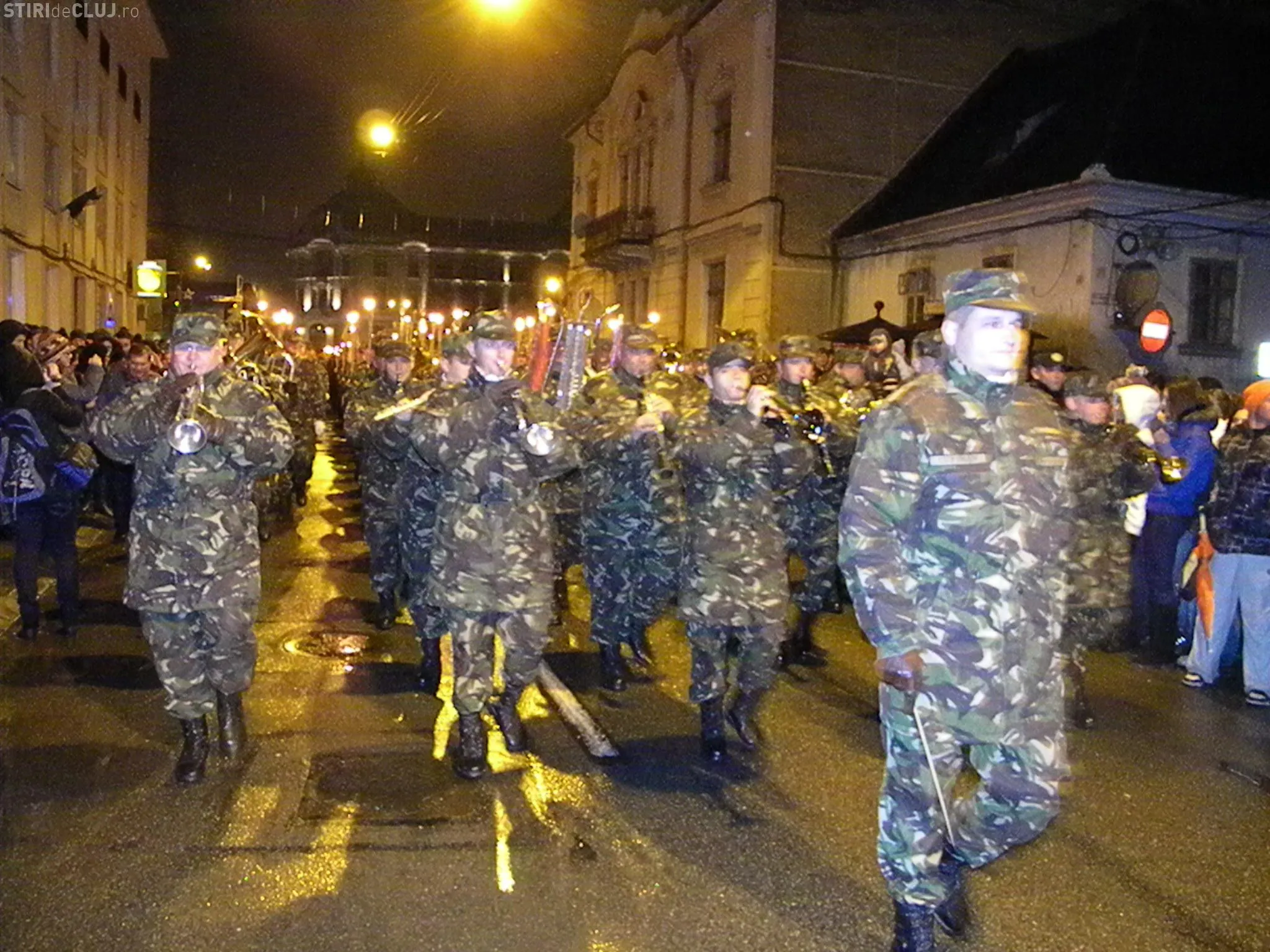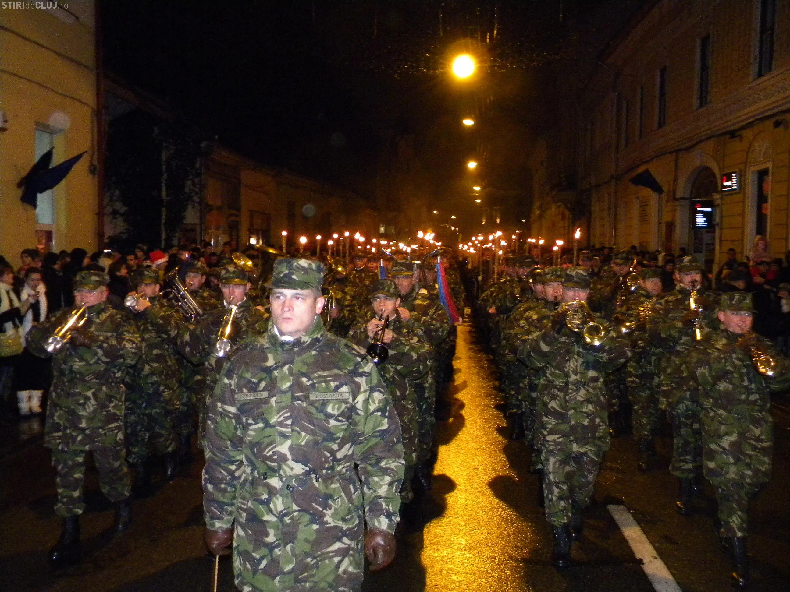 Inainte de focul de artificii a fost organizata o retragere cu torte din Piata Lucian Blaga pana in Piata Avram Iancu. Militarii au intonat Imnul National si au fost insotiti de sute de clujeni, pe Bulevardul Eroilor.