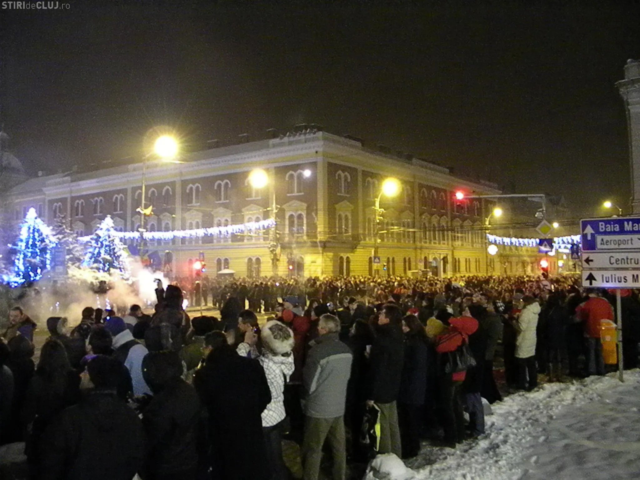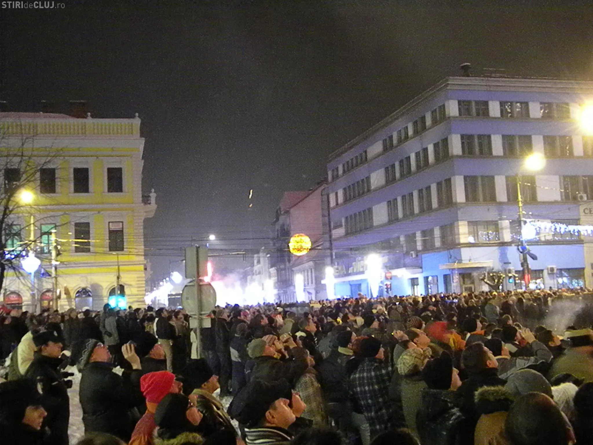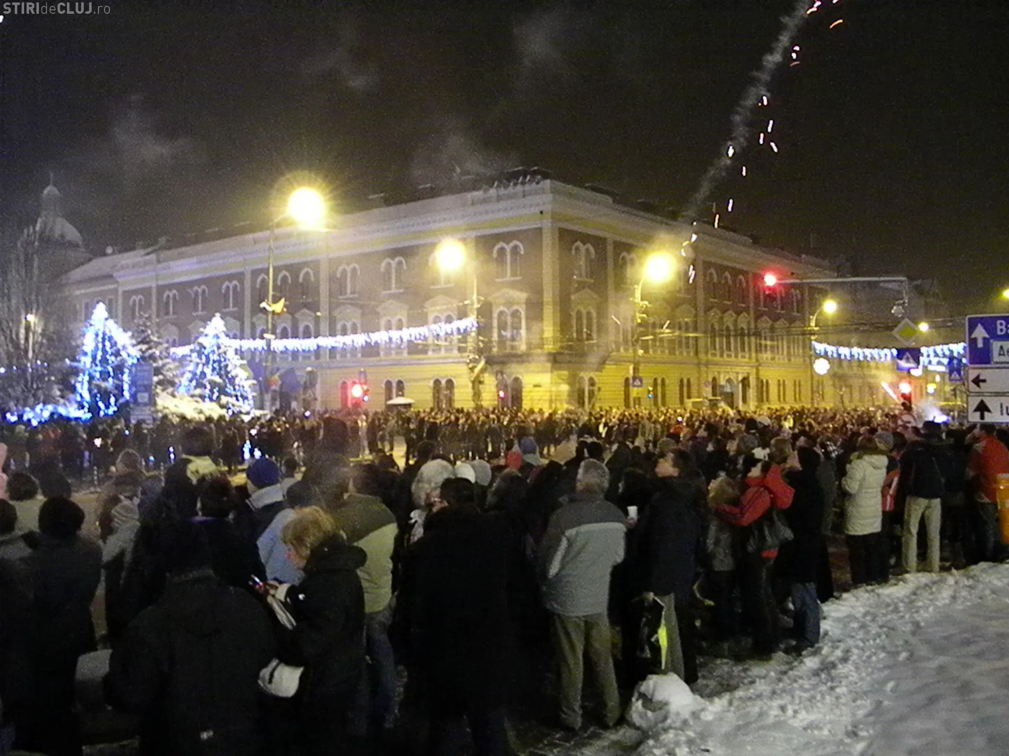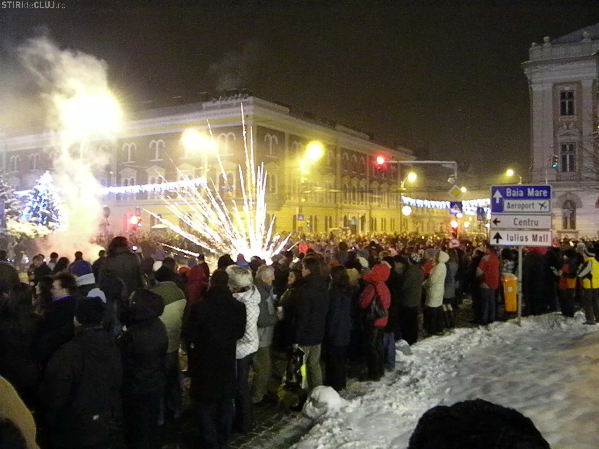 5.000 de clujeni de toate varstele s-au adunat in noaptea de Revelion in Piata Avram Iancu pentru a vedea focul de artificii si pentru a inchina o cupa de sampanie.