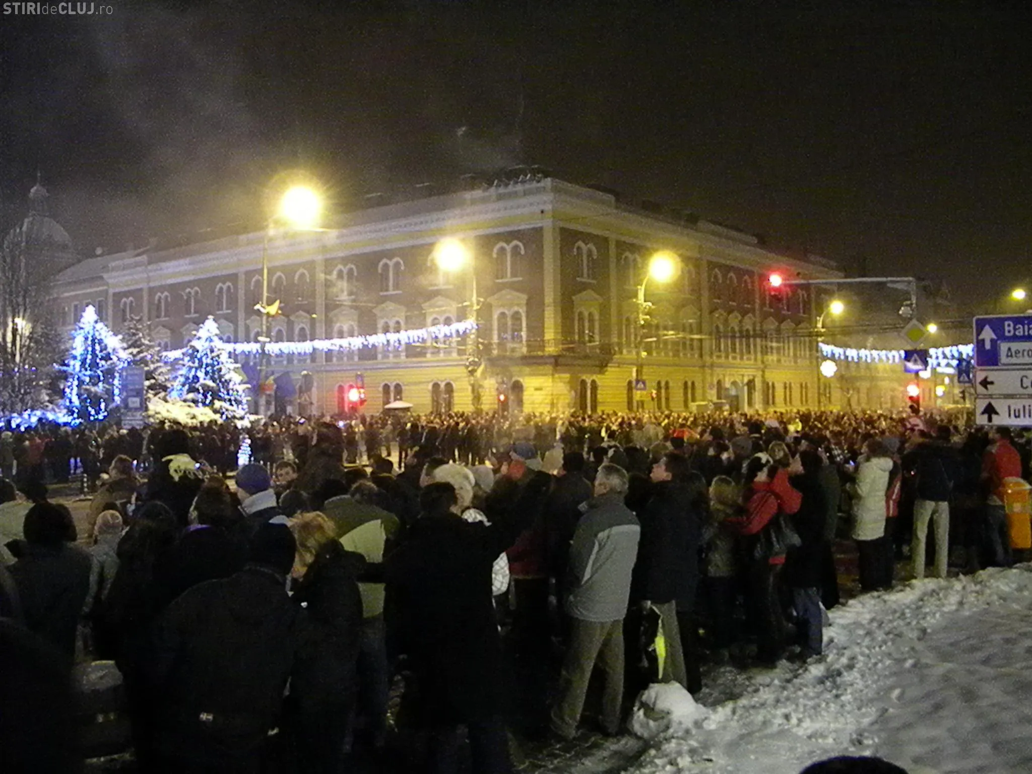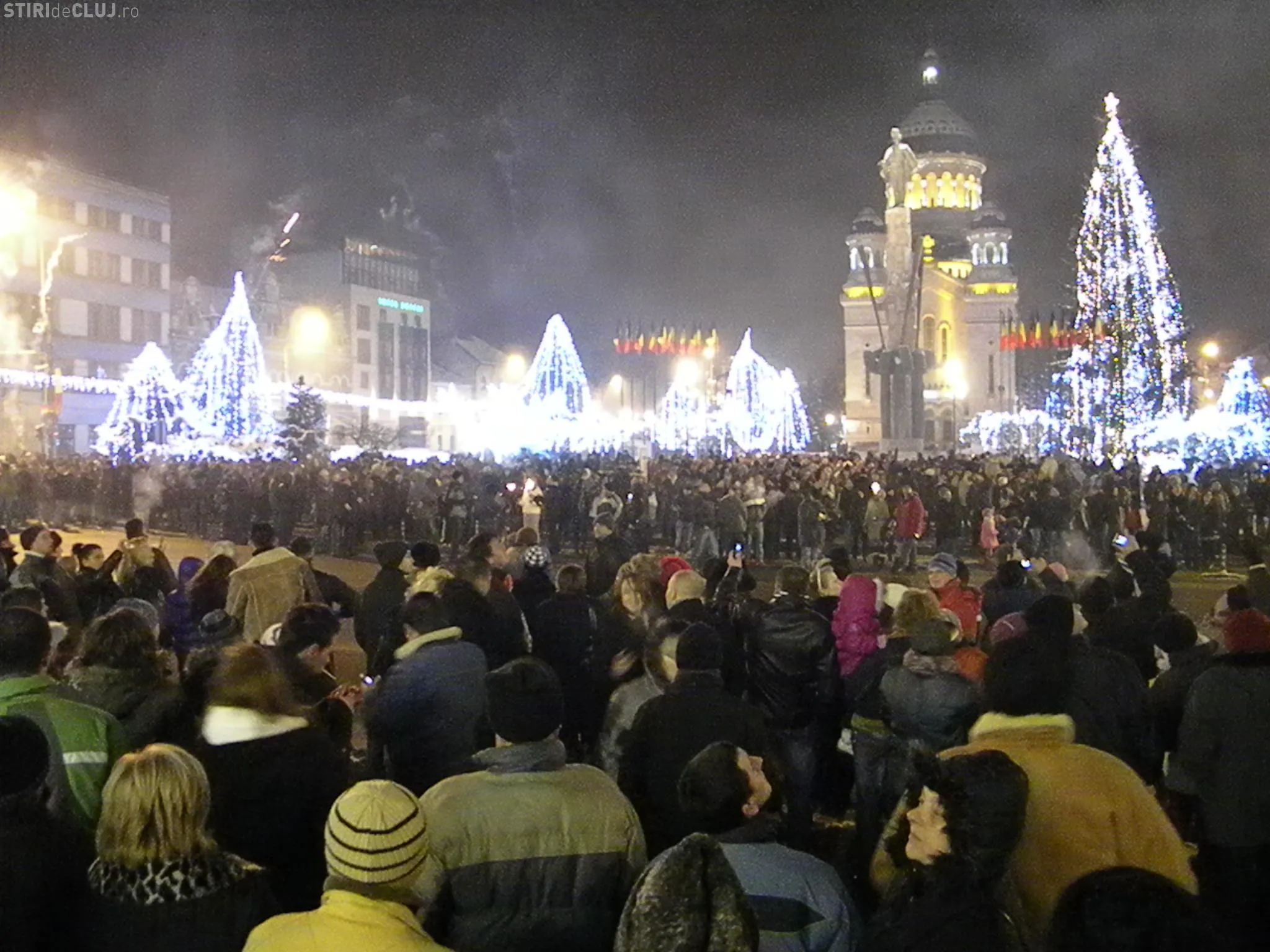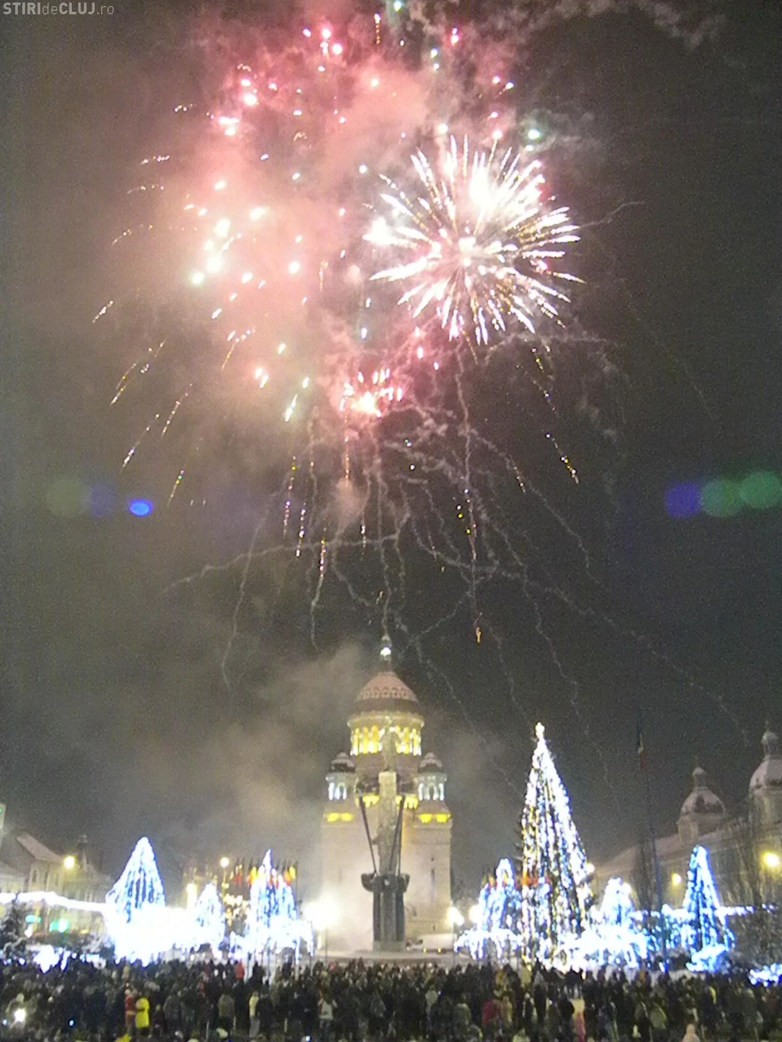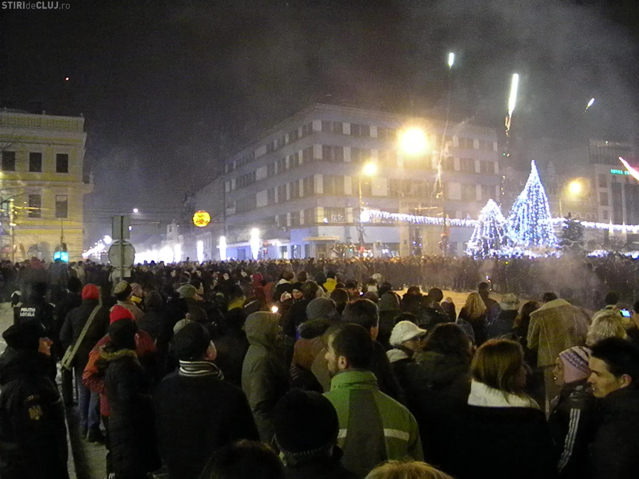5.000 de clujeni de toate varstele s-au adunat in noaptea de Revelion in Piata Avram Iancu pentru a vedea focul de artificii si pentru a inchina o cupa de sampanie.