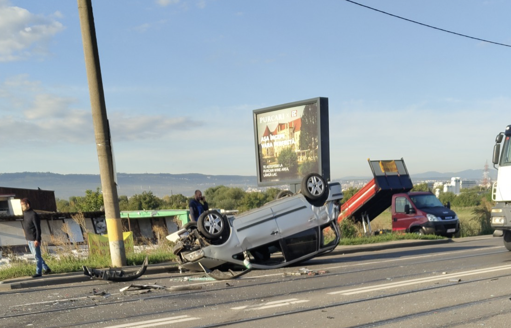 VIDEO Accident grav pe Bulevardul Muncii din Cluj! Mașină răsturnată în trafic, două persoane au avut nevoie de îngrijiri medicale