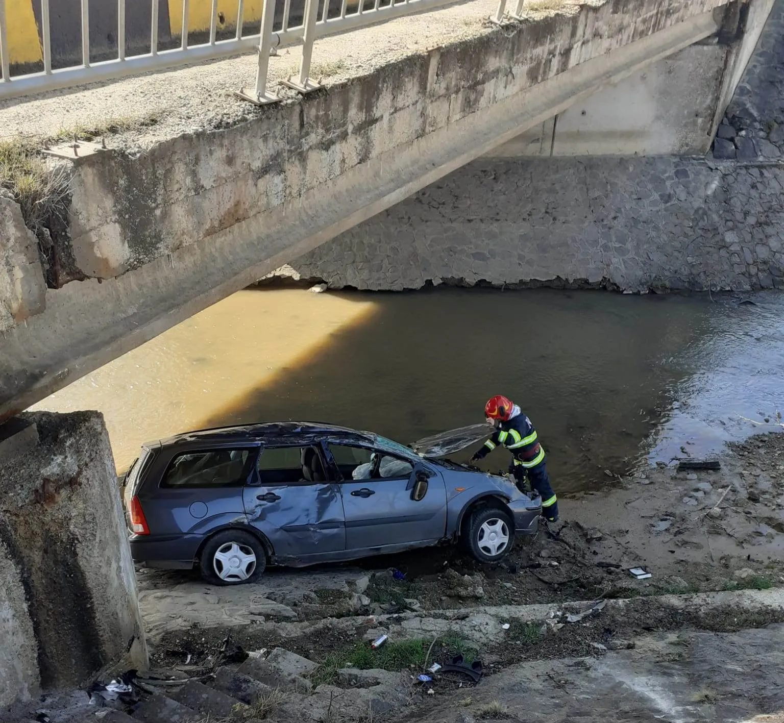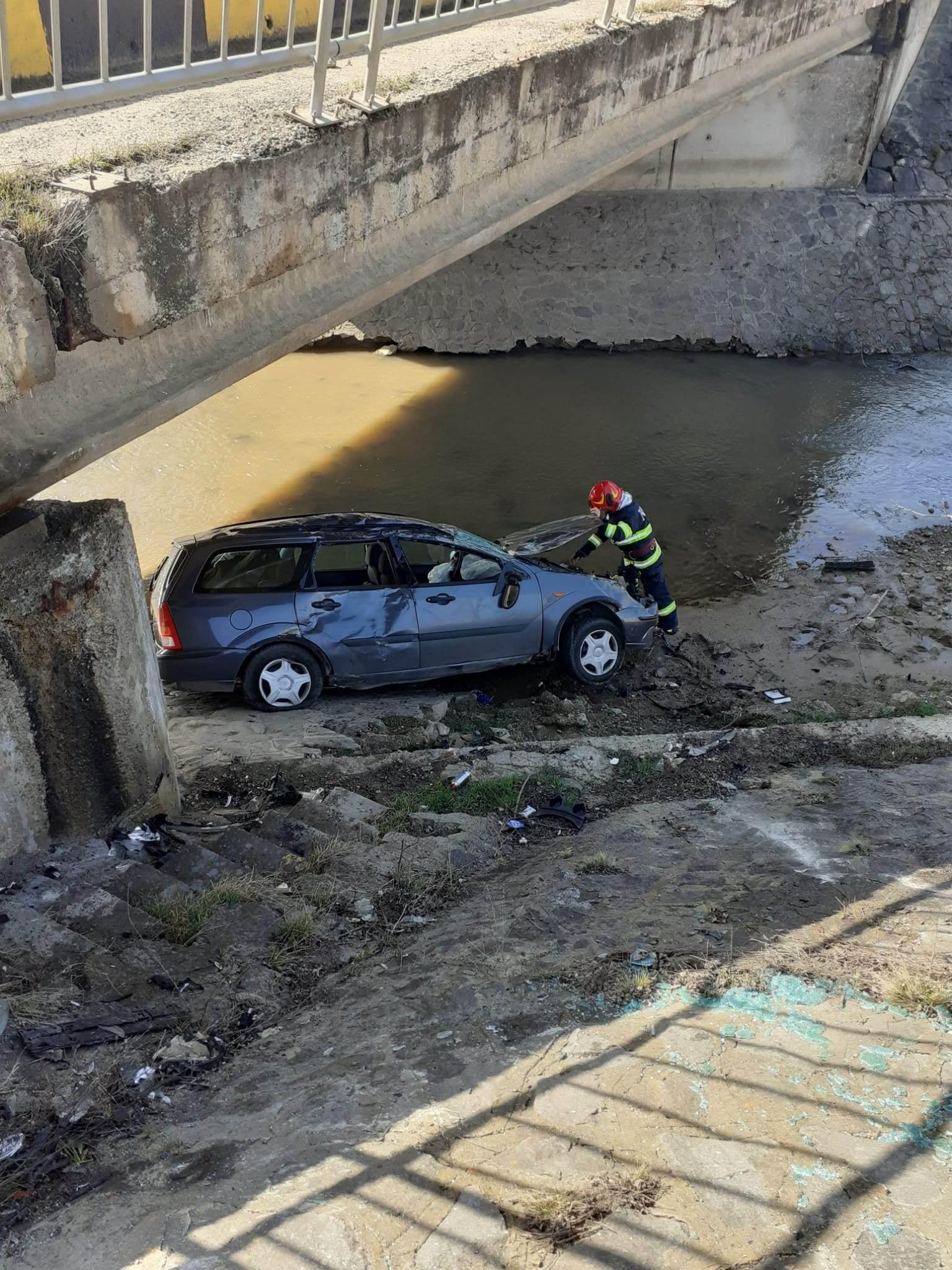 Apelul de urgență a venit în jurul orei 10:06, iar la fața locului s-au deplasat echipajele Gărzii de Intervenție Aghireșu. Pompierii au găsit la fața locului un autoturism căzut sub un pod.