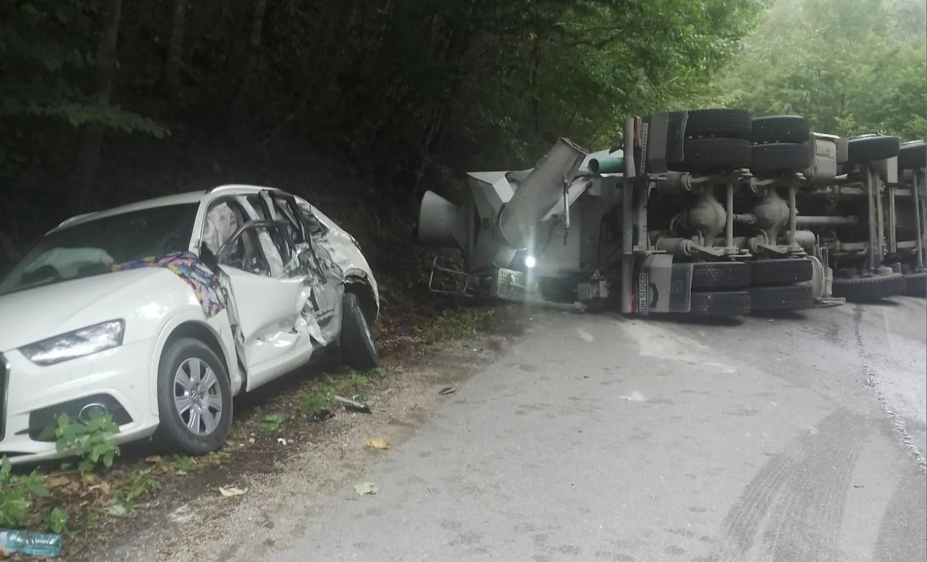 FOTO Accident șocant în Cluj, într-o zonă turistică: O autobetonieră s-a răsturnat, o mașină a fost făcută praf, iar un bărbat a ajuns de urgență la spital