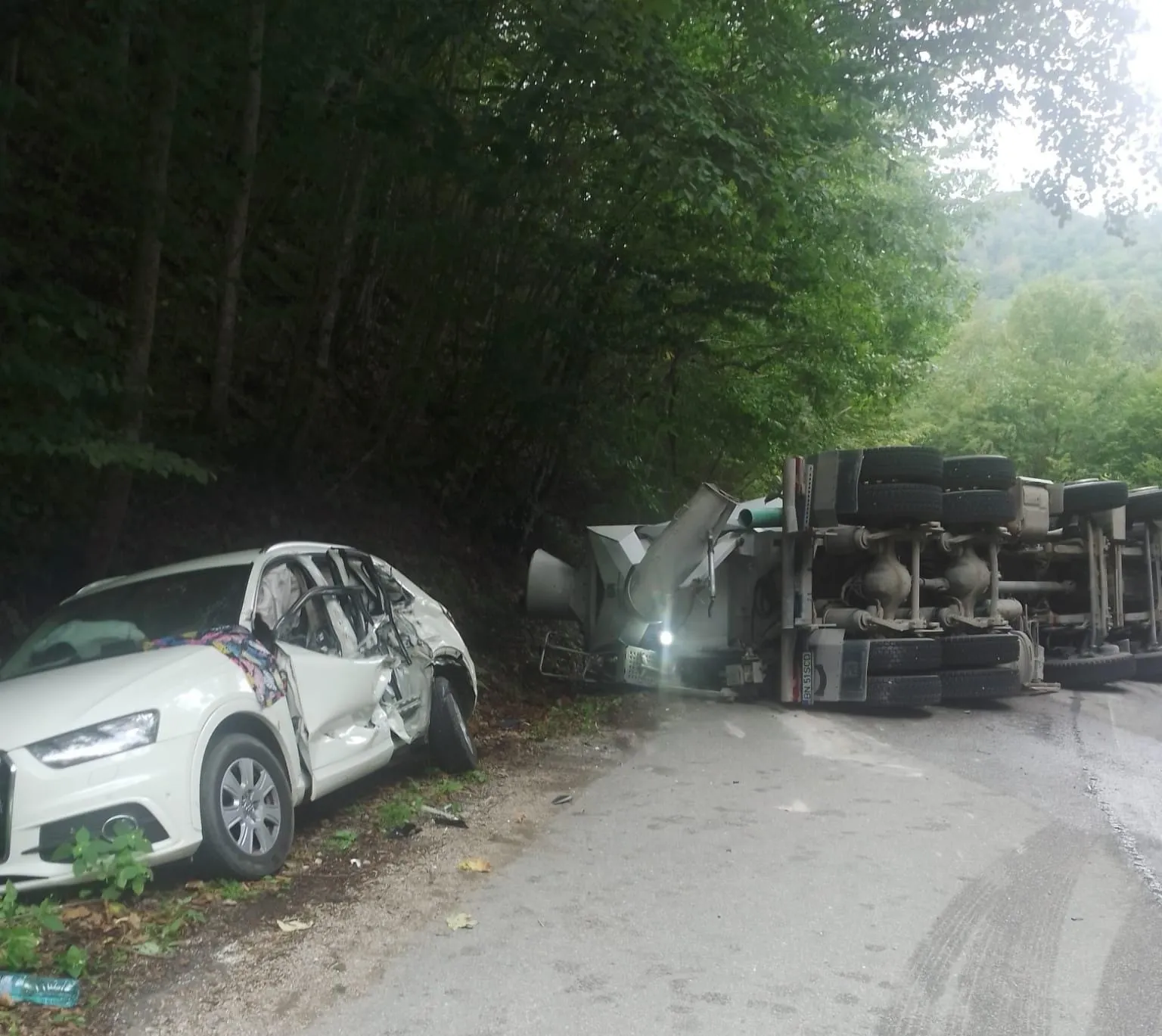 Accident la Tarnița, în zona Village: autobetonieră răsturnată și o mașină avariată. Un bărbat a ajuns la spital