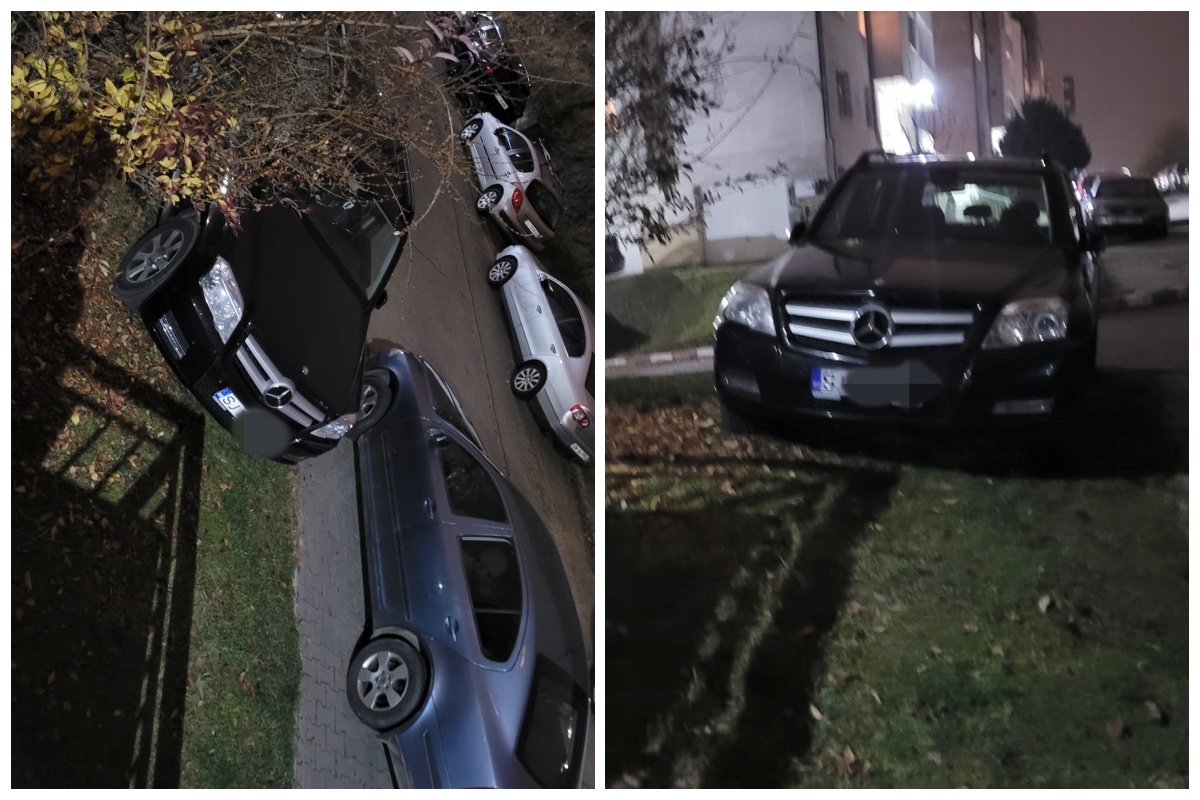 Pentru că trotuarul era probabil prea plin, șoferul a trecut la nivelul următor: s-a urcat cu mercedesul direct pe spațiul verde.