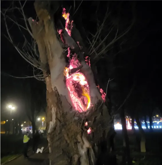 FOTO - La un pas de incendiu, într-un parc din Câmpia Turzii. Au aprins un copac cu petardele