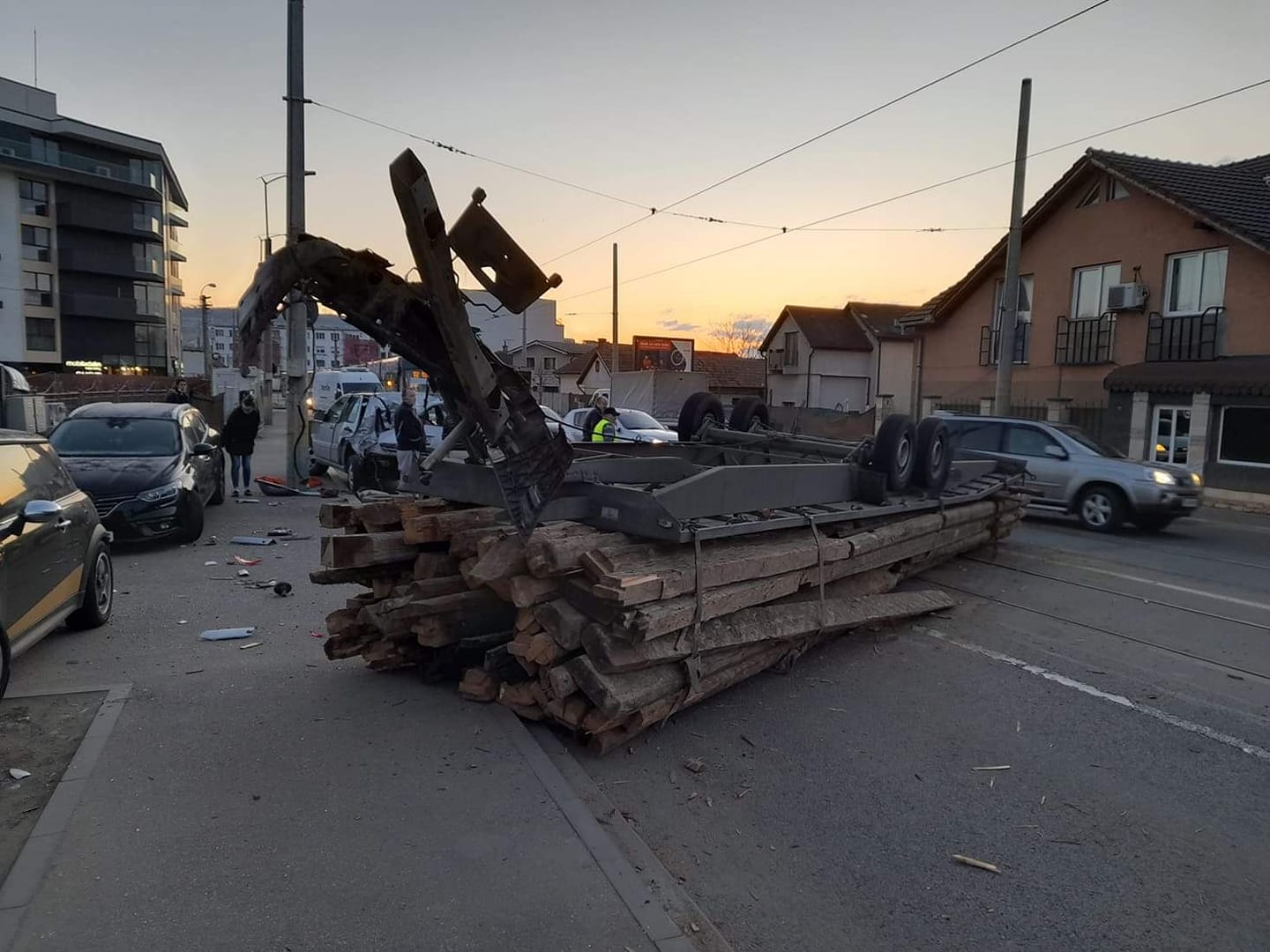 FOTO - O remorcă plină cu lemne s-a răsturnat pe mijlocul străzii Oașului din Cluj-Napoca