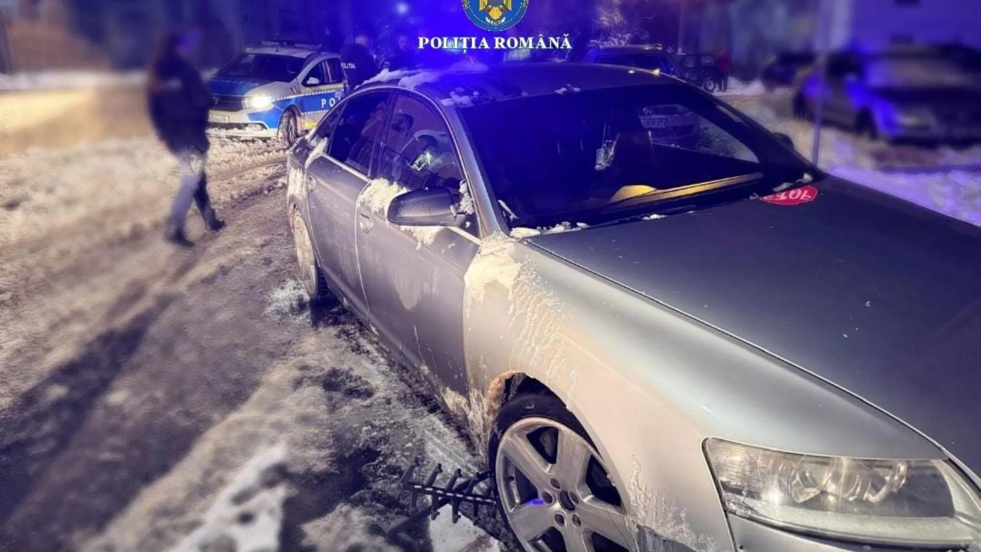 FOTO Urmărire ca în filme cu final neașteptat în Cluj: Un bărbat a furat o mașină, iar polițiștii l-au prins cu ajutorul unui sistem Spyke Strip