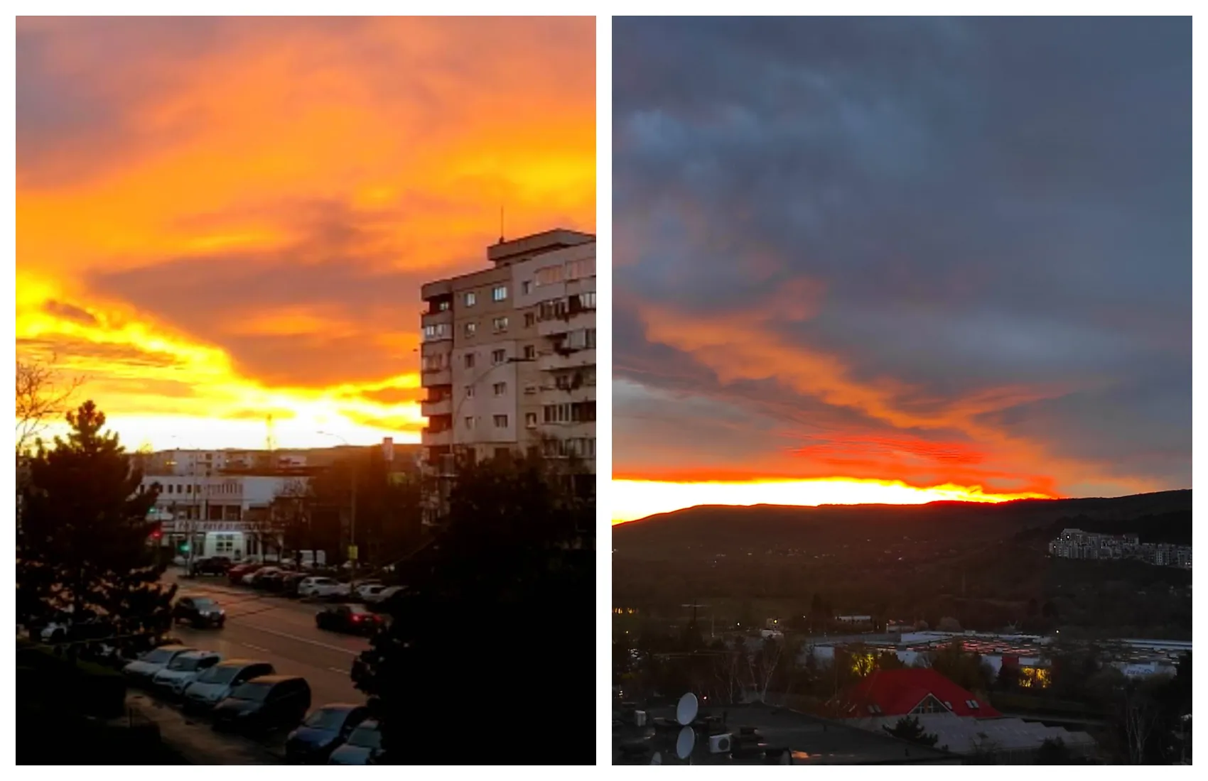 Într-un video publicat pe o rețea de socializare, dar și într-o serie de imagini, se observă cum pe cer s-au reflectat nuanțe de portocaliu aprins mov și roz, creând astfel o atmosferă impresionantă.
