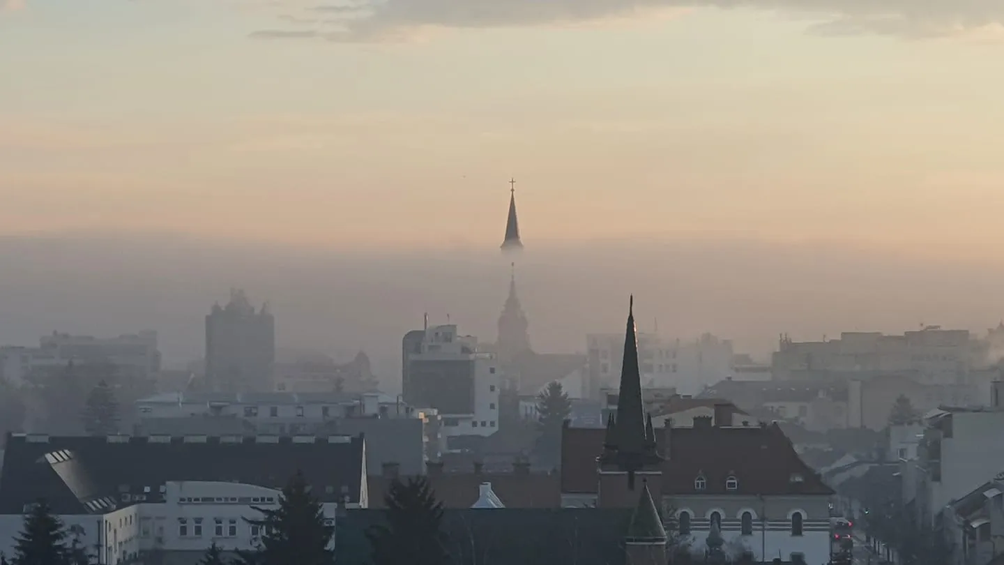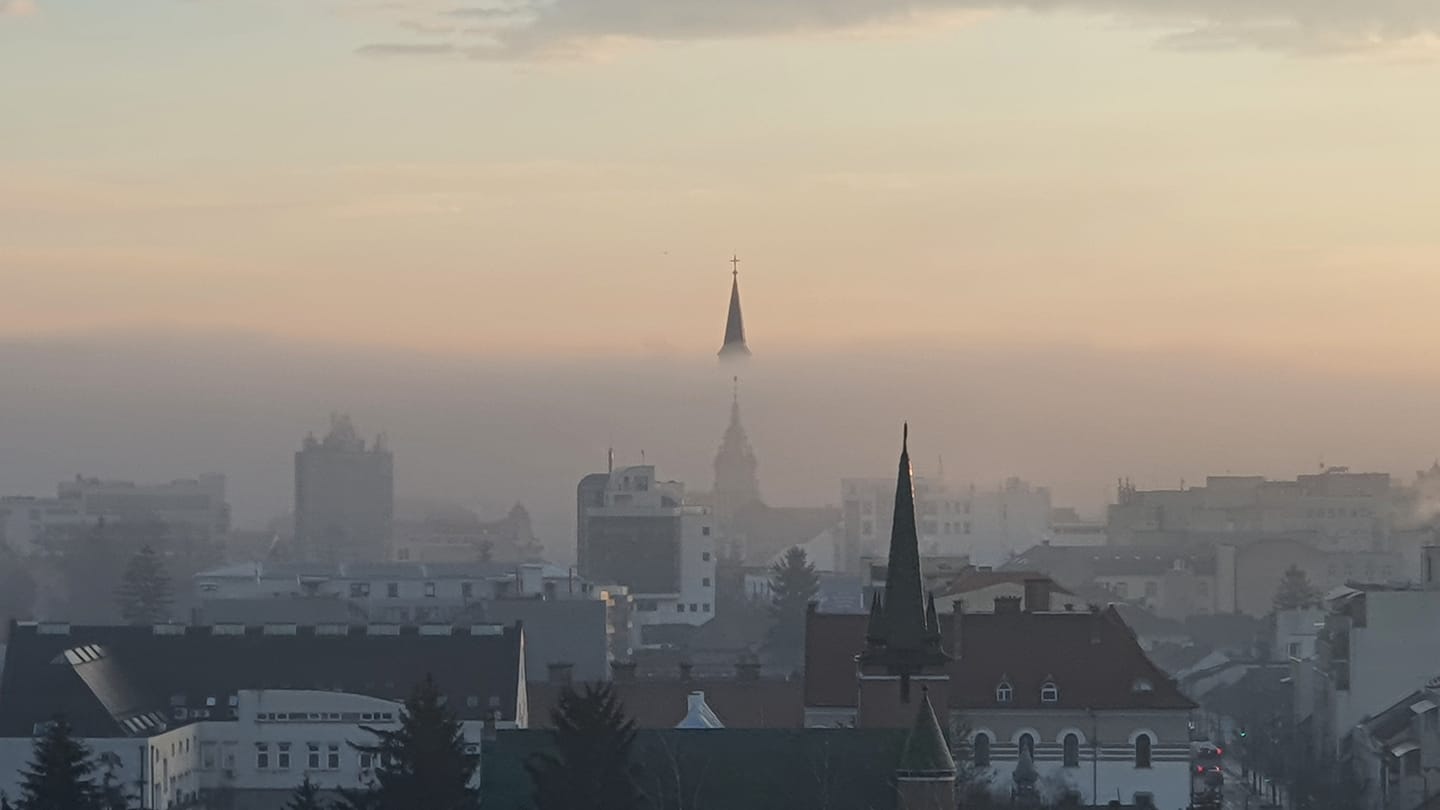 Din ceață apar turlele bisericilor din centrul Clujului.