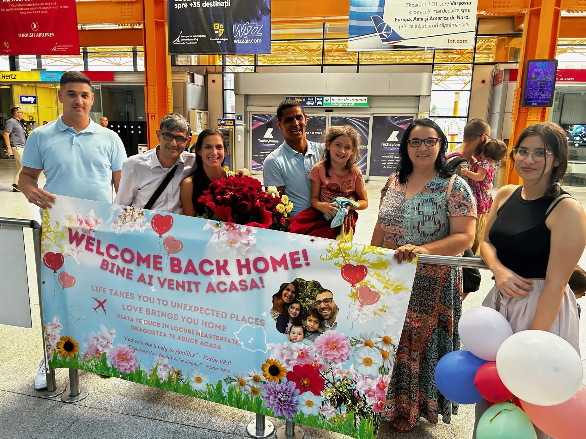 Cei cinci au aștepta-o la poarta sosiri cu un banner pe care au scris ”Bine ai venit acasă! Viața te duce în locuri neașteptate. Dragostea te aduce acasă. Dumnezeu dă o familie celor singuri!”.