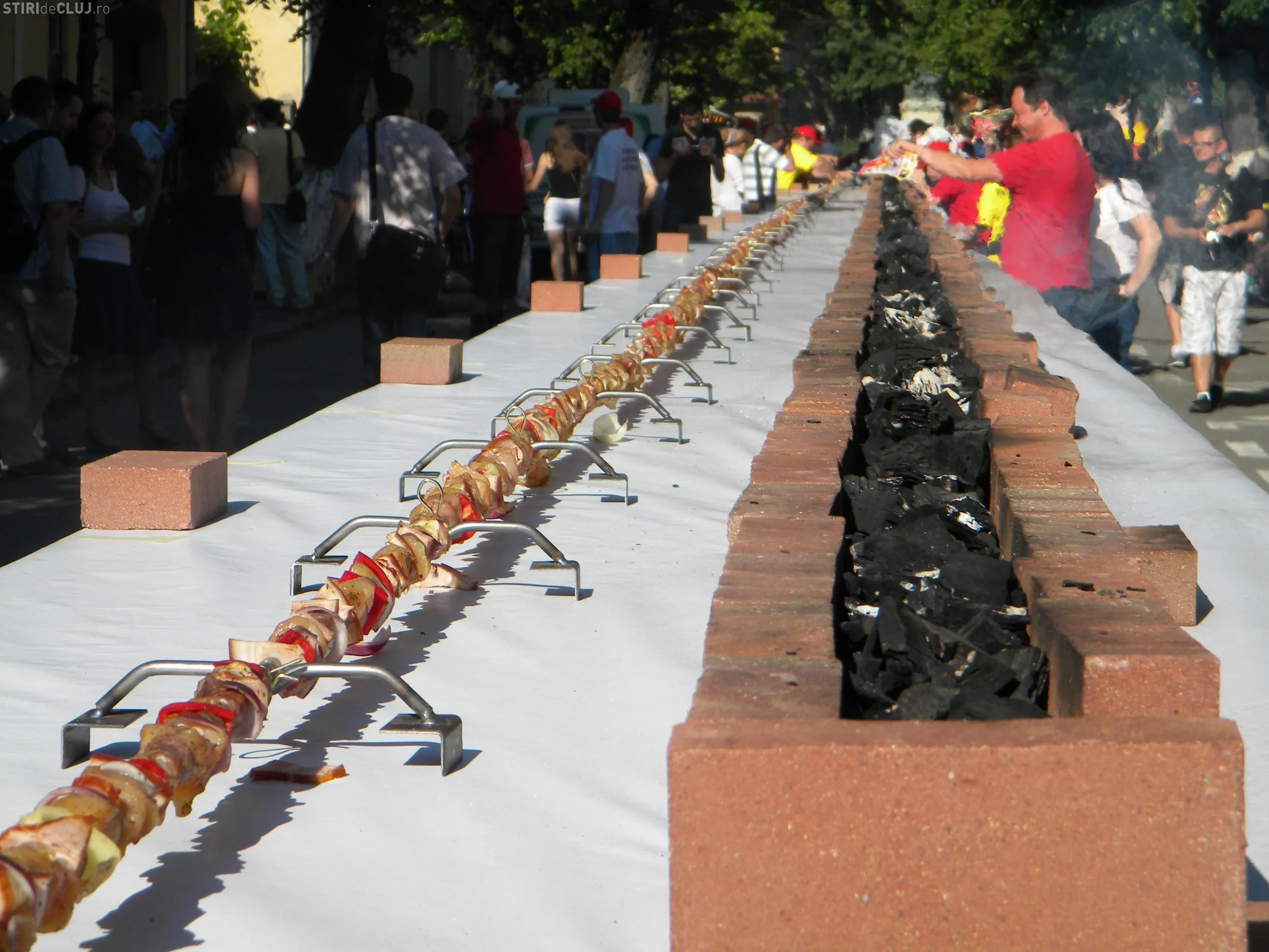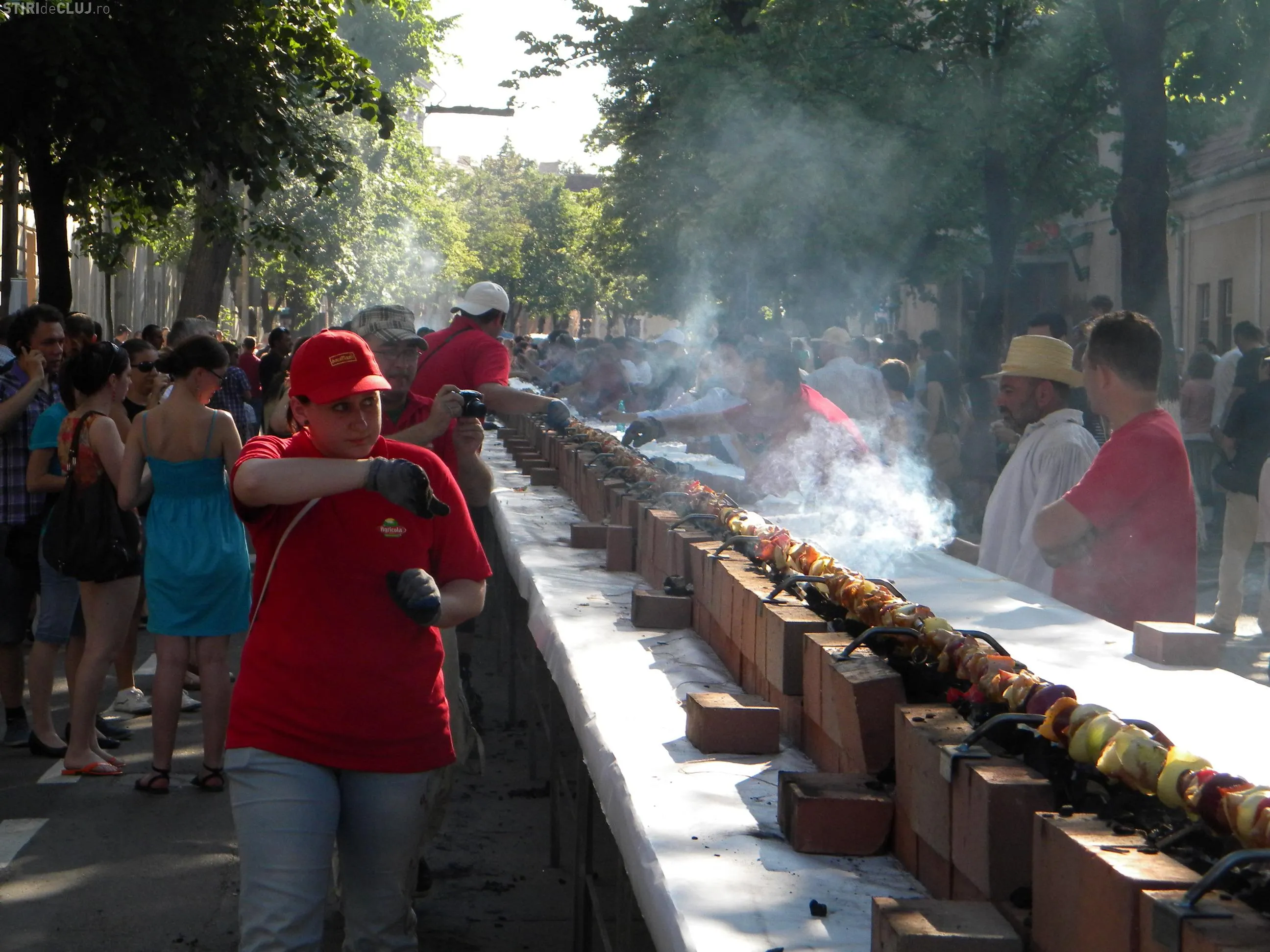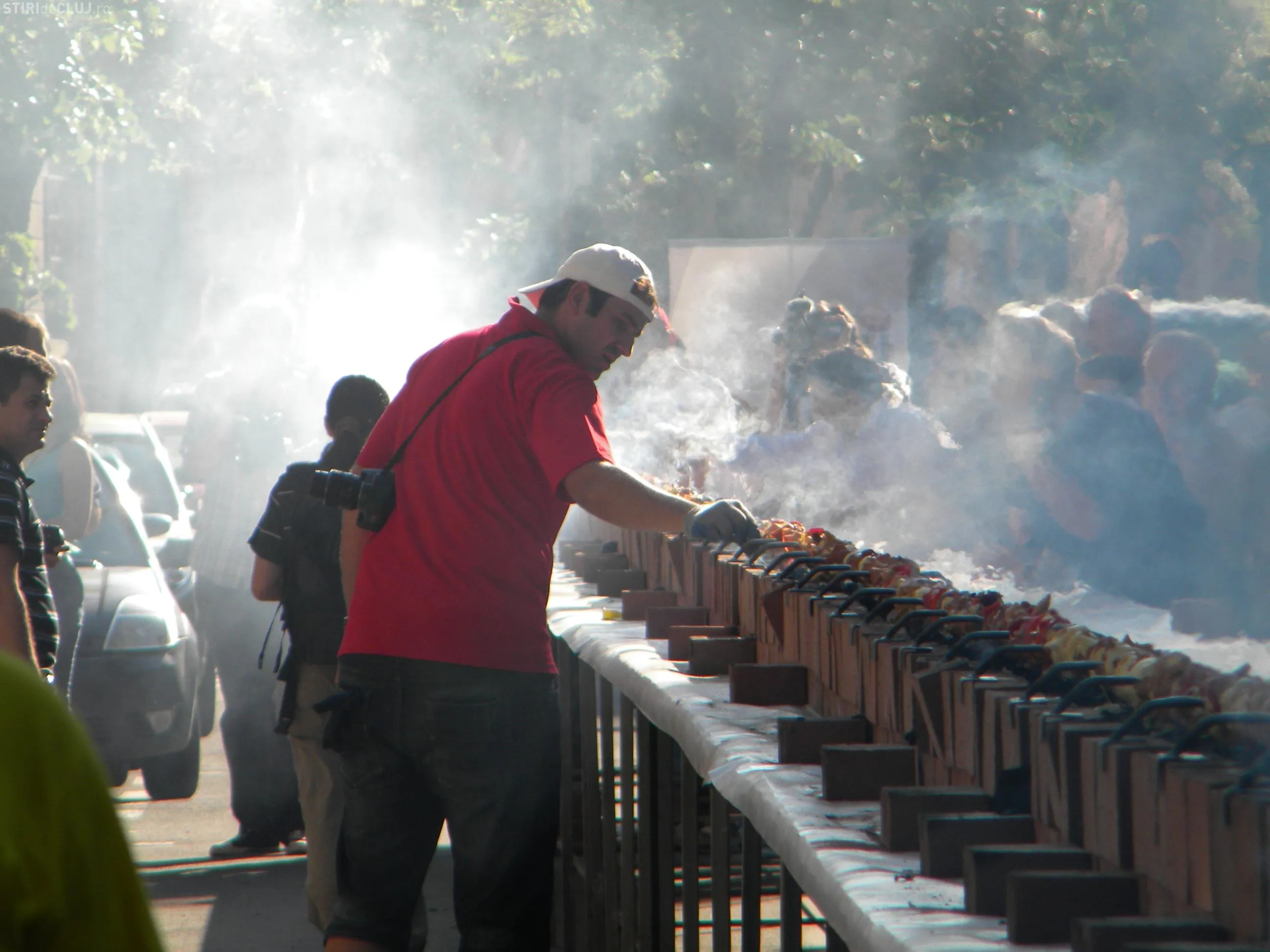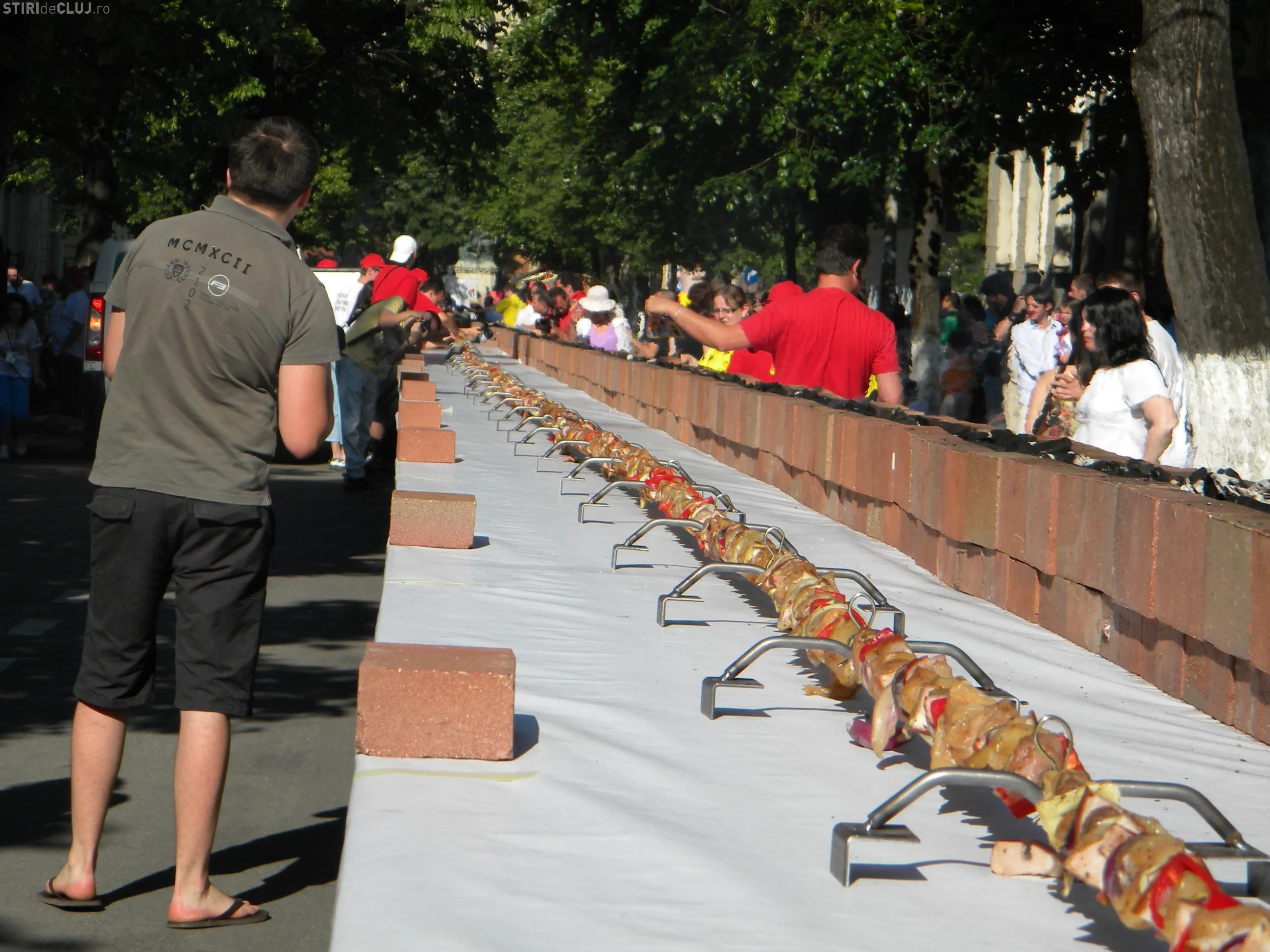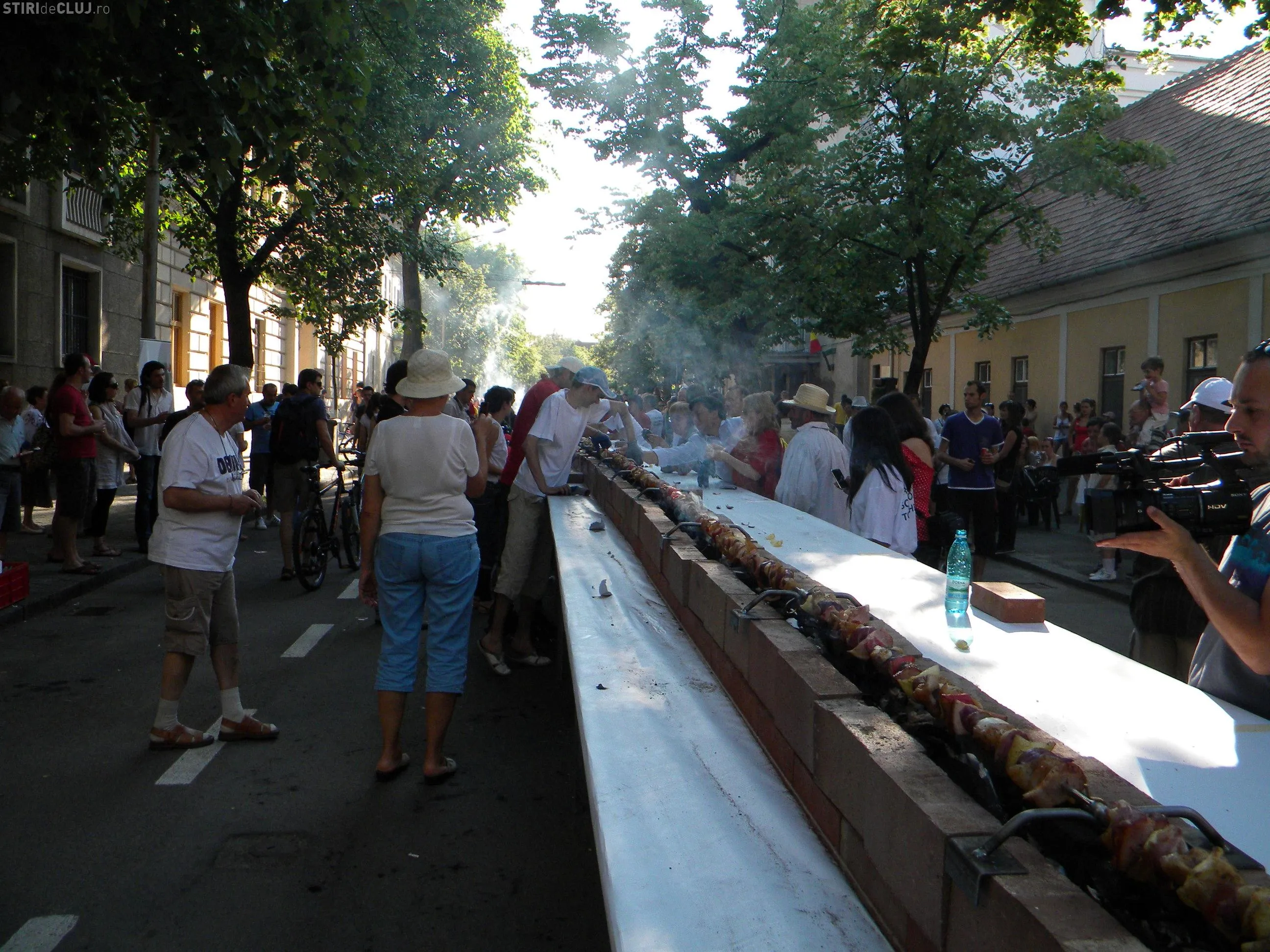 In jurul orei 19.00, clujenii au fost o coada lunga de circa 10 metri pe strada Mihail Kogalniceanu pentru a gusta din frigaruia gigant. "Am vandut portiile contra unor donatii de 5 lei, iar banii vor merge catre o asociatie care are grija de cipiii care fac dializa. Asa se explica si numarul mare de clujeni care vor sa guste din munca noastra", a mai spus la final Adi Hadean.