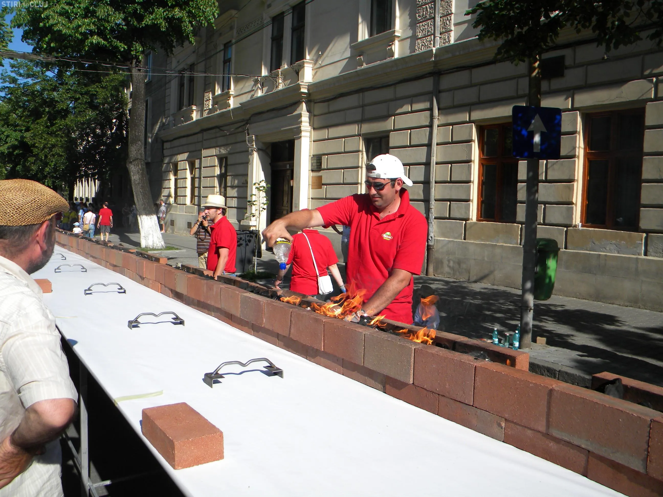 Carbunii au "cedat" in cele din urma determinarii armatei de bloggeri si frigaruia lunga de 101 metri a fost asezata deasupra jarului.