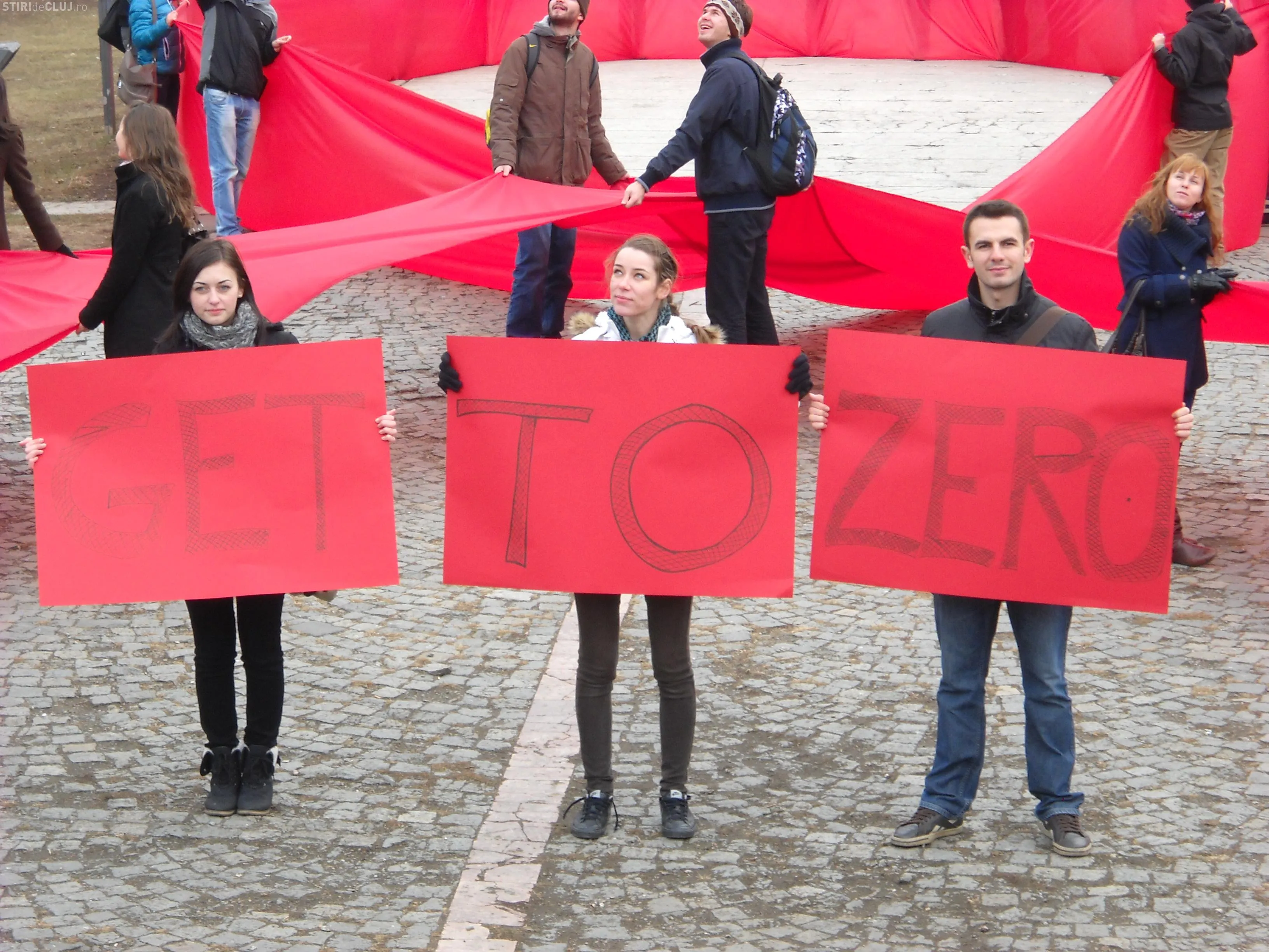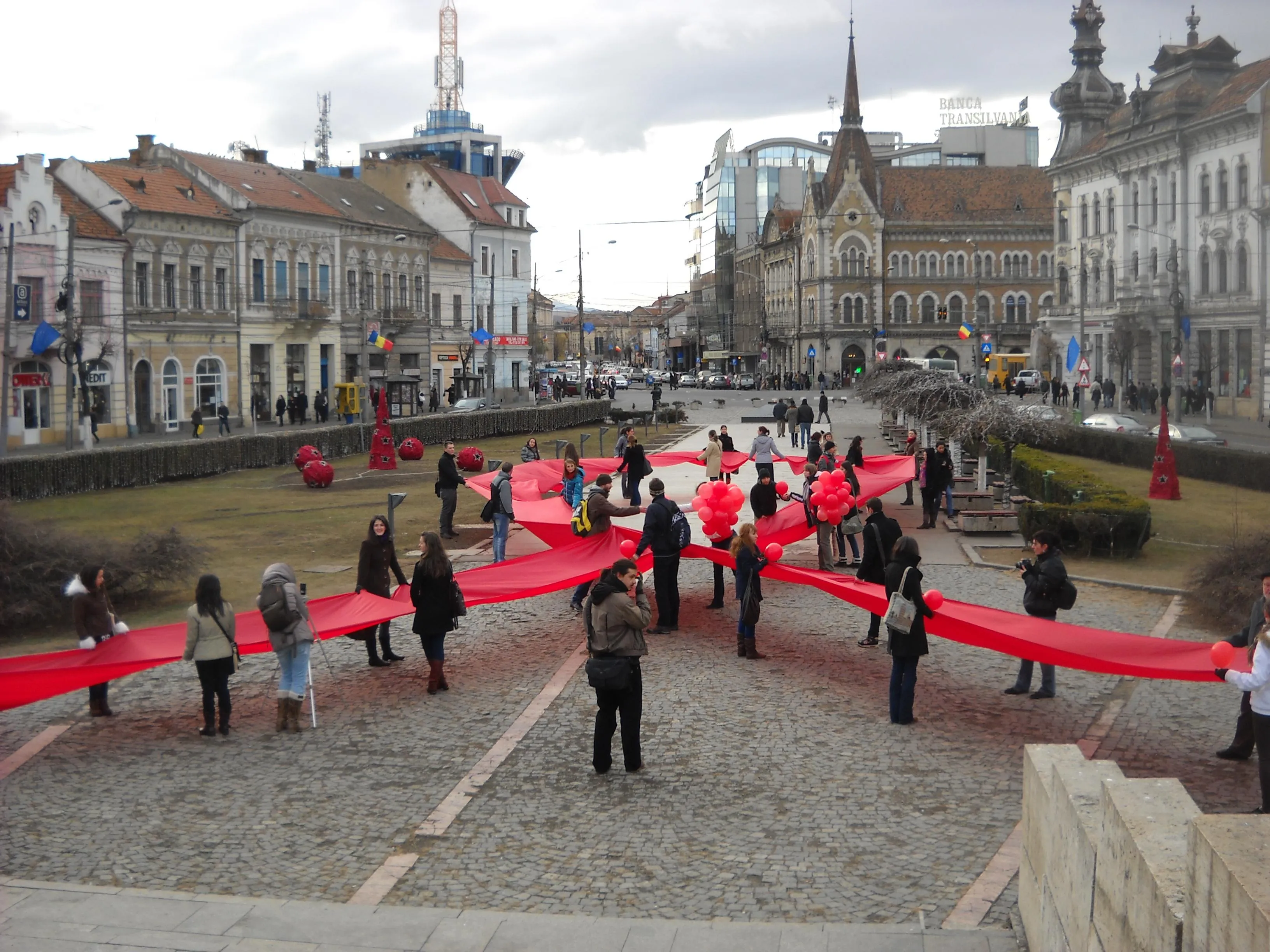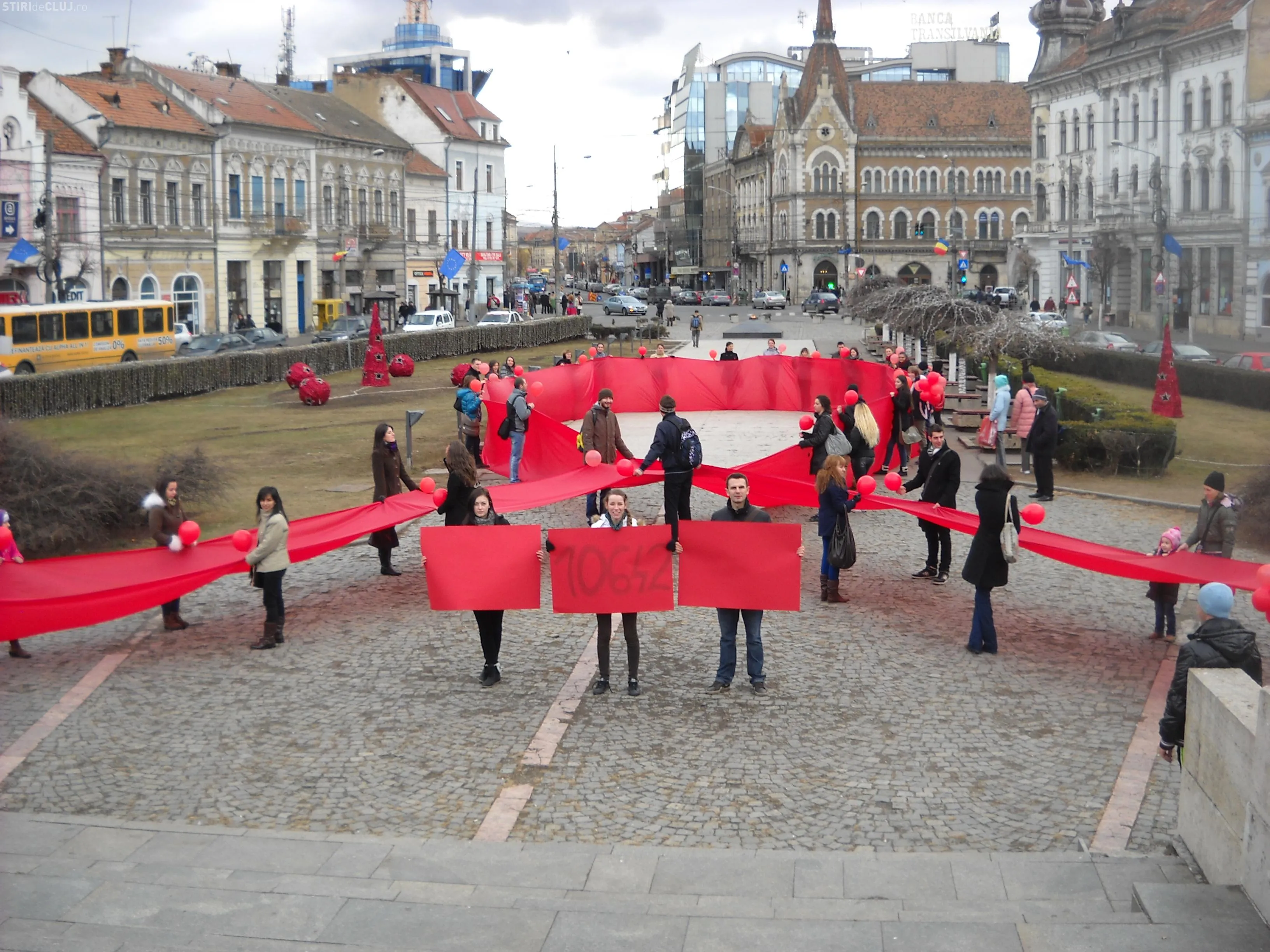 Voluntarii din Organizatia Studentilor Medicinisti (OSM) au format o fundita umana astazi in Piata Mihai Viteazul, pentru a marca Ziua Mondiala de lupta impotriva HIV/SIDA.