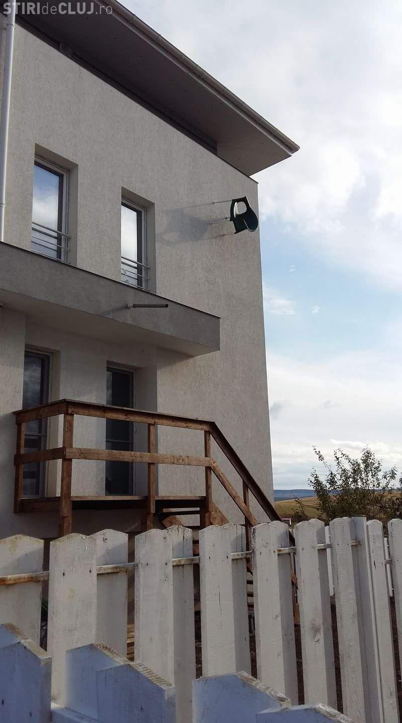 Fotografia realizată de un clujean în Apahida arată cât de puternic a suflat vântul. Scaunul de pe o terasă a fost luat pe sus ca o foaie de hârtie și înfipt în peretele unui bloc.