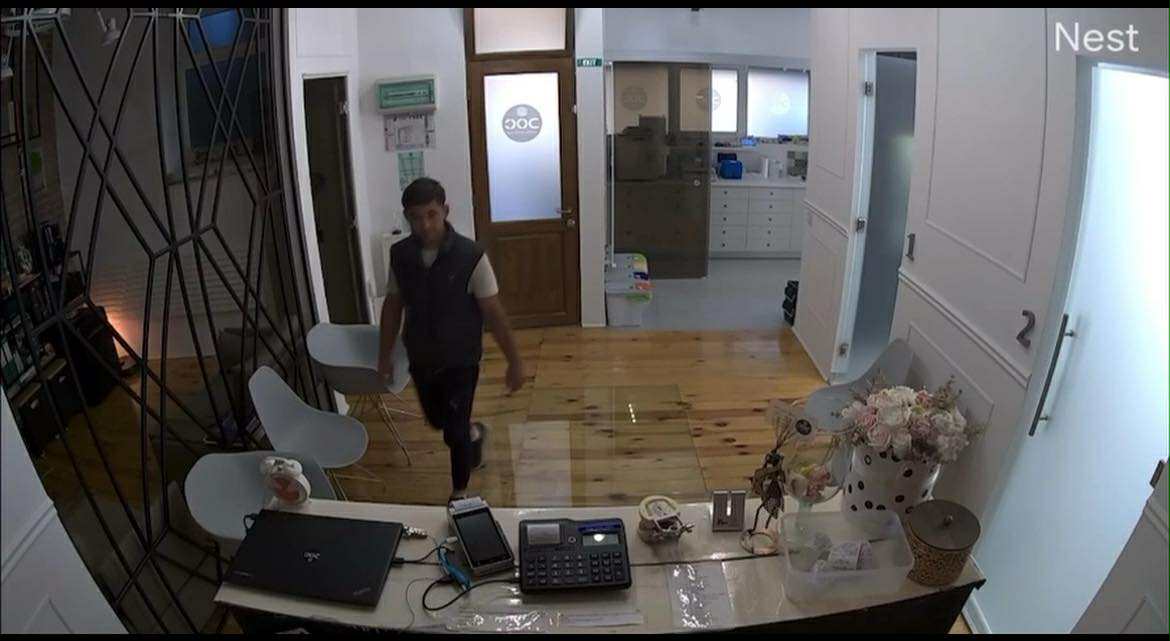 Bărbatul suspect a intrat pe ușa din spate a clinicii, a inspectat cu atenție zona recepției și vestiarul medicilor, profitând de faptul că soția doctorului era ocupată cu un pacient. Când a fost observat, acesta a acuzat o problemă dentară și a cerut o programare pe loc, reușind astfel să se apropiie fără să stârnească suspiciuni.