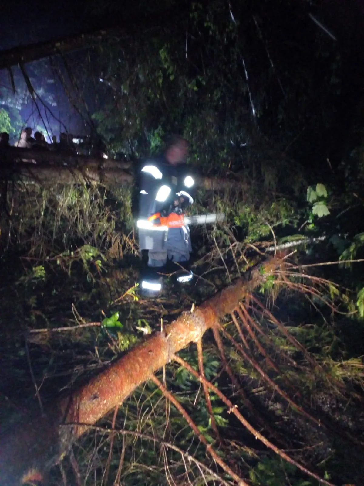 Pompierii din Gilău au intervenit sâmbătă seara, după furtuna puternică ce a lovit județul Cluj, pentru a degaja brazii căzuți pe carosabil între Șomeșul Rece și Mărișel.