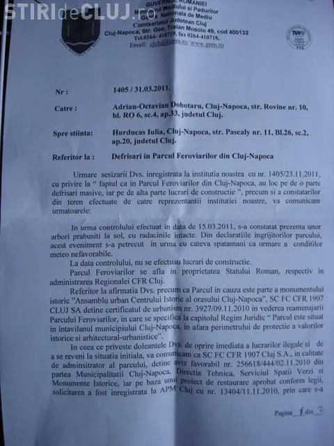 "In urma controlului efectuat in data de 15.03.2011, s-a constatat prezenta unor arbori prabusiti la sol, cu radacinile intacte. Din declaratiile ingrijitorilor parcului, acest eveniment s-a petrecut in urma cu cateva saptamani ca urmare a conditiilor meteo nefavorabile", se arata in raspunsul trimis de Garda de Mediu Cluj in urma sesizarilor facute de societatea civila.