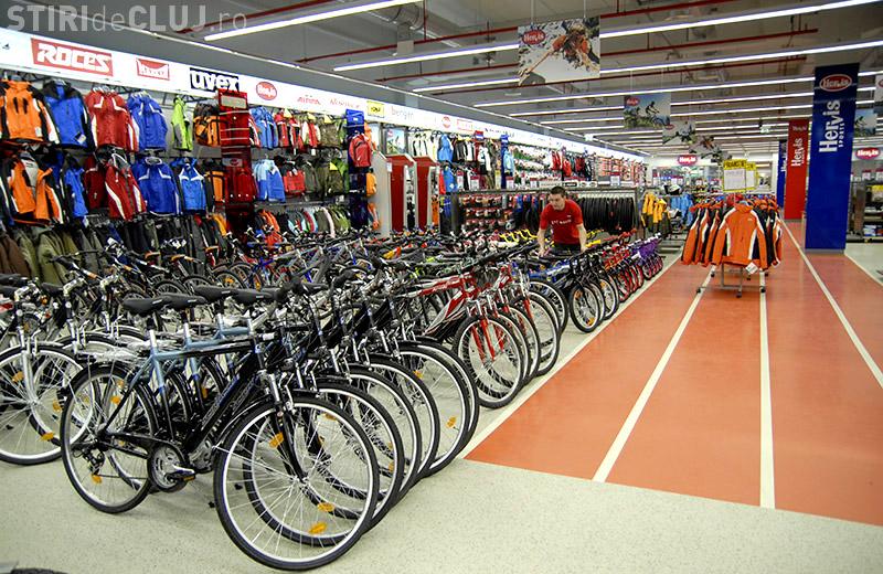 Un clujean reclama reducerile de "forma" practicate de magazinul Hervis, in Polus Center.
