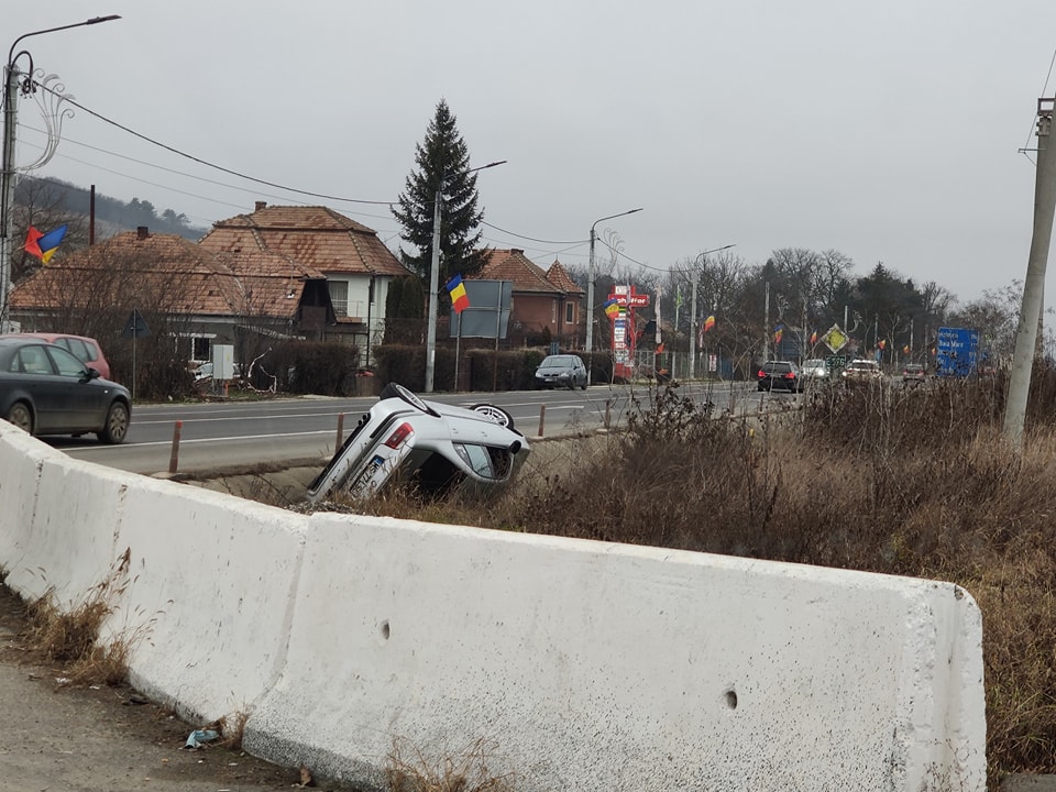Graba strică treaba! Asta a învățat un șofer din Cluj, pe propria piele joi dimineața, după ce a ajuns cu roțile mașinii în sus, în afara carosabilului.
