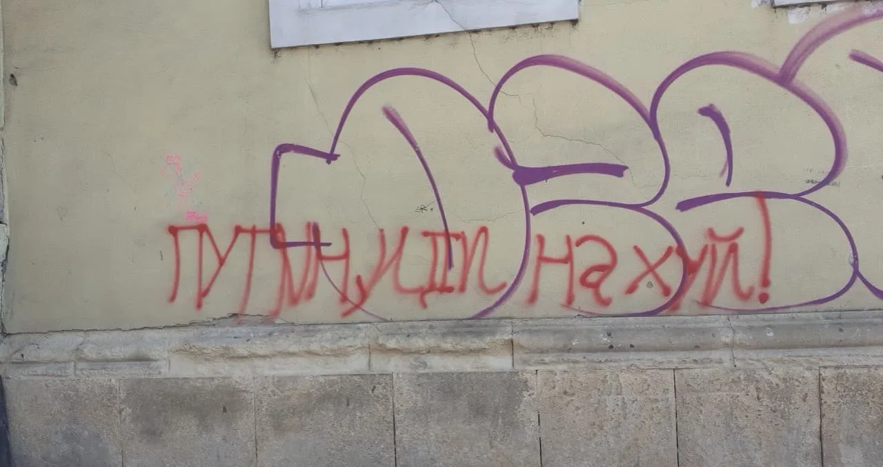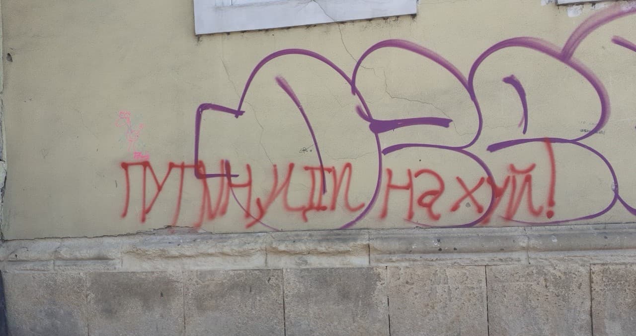 Pe o clădire scrie: ”Putin dute în p...ă”, replica militarilor de la Insula Șerpilor.