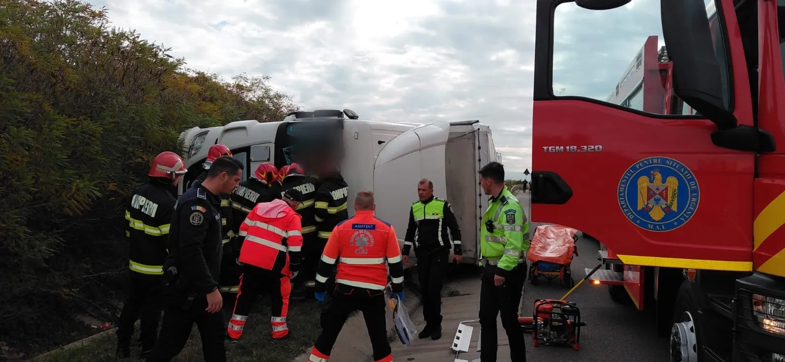 În accident au fost implicate două autocamioane, dintre care unul este răsturnat. De asemenea, în interiorul autocamionului răsturnat s-a aflat un bărbat încarcerat, pe care pompierii l-au extras în siguranță.