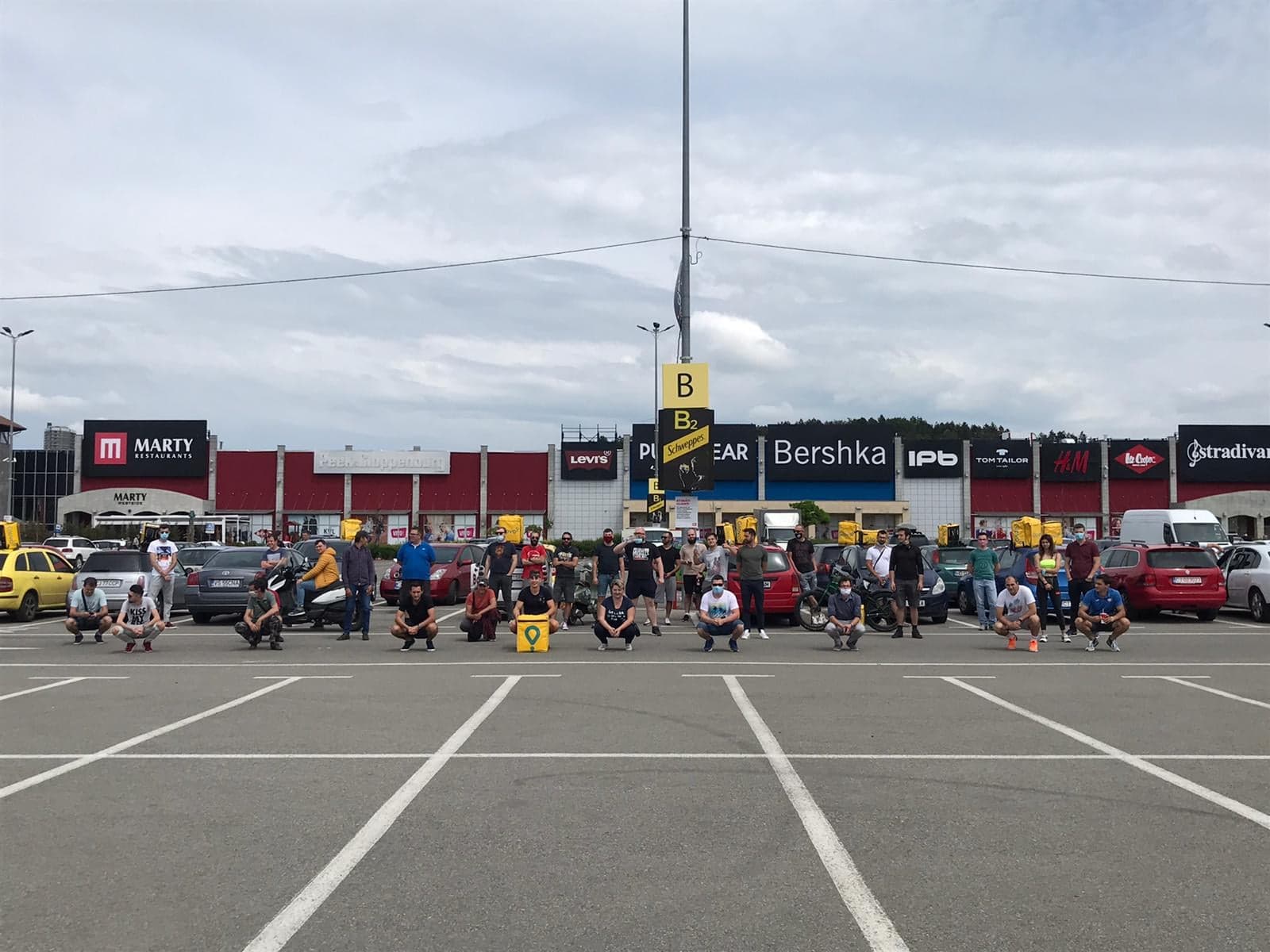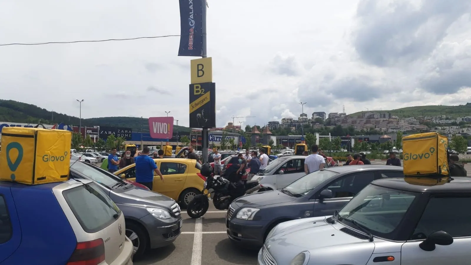 Curierii Glovo protestează din nou, dar de această dată în parcarea centrului comercial Vivo Cluj.
