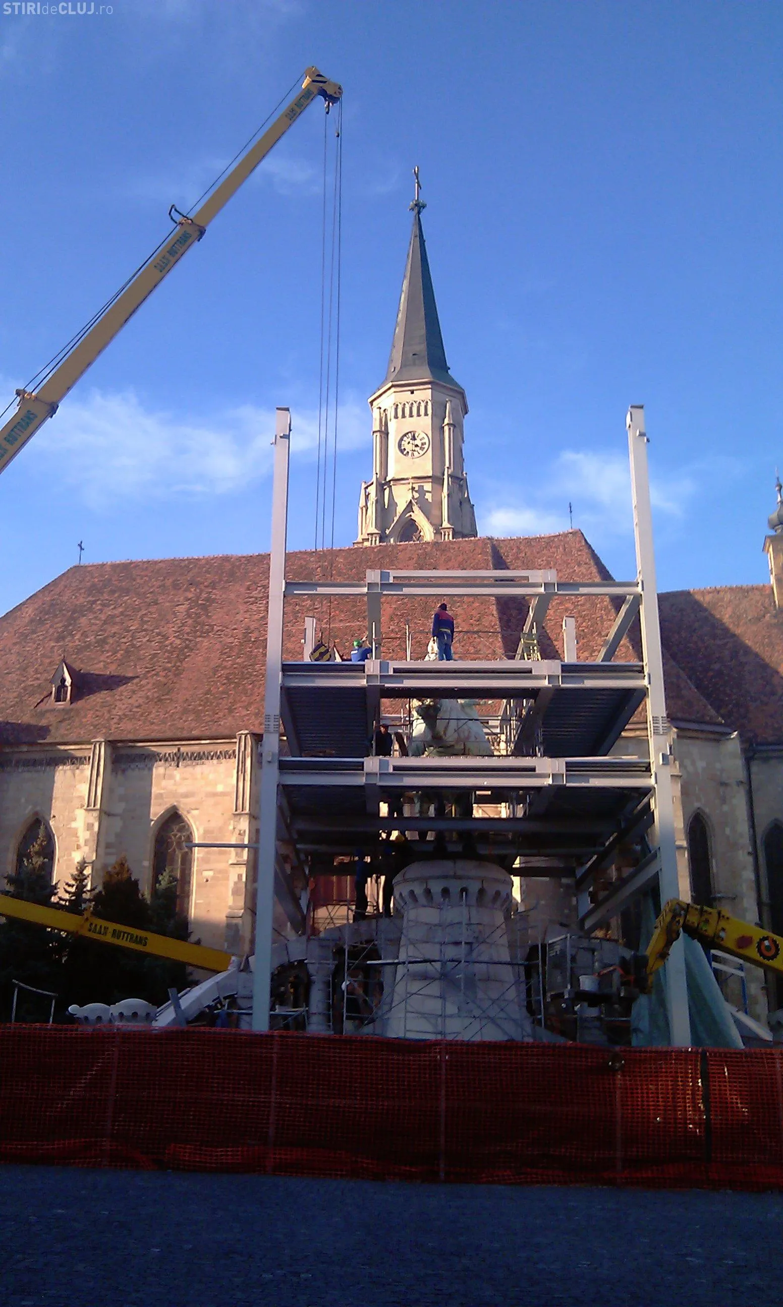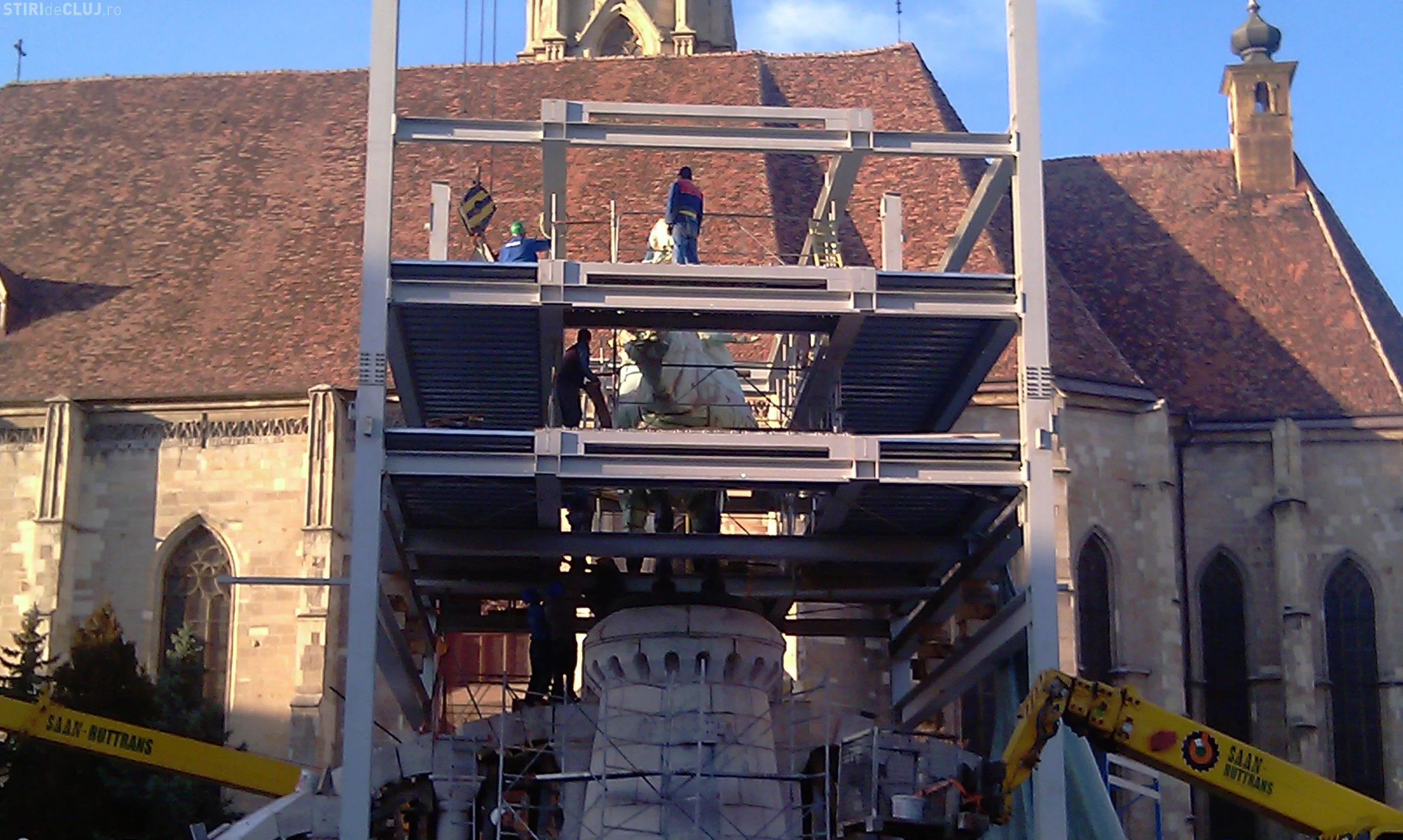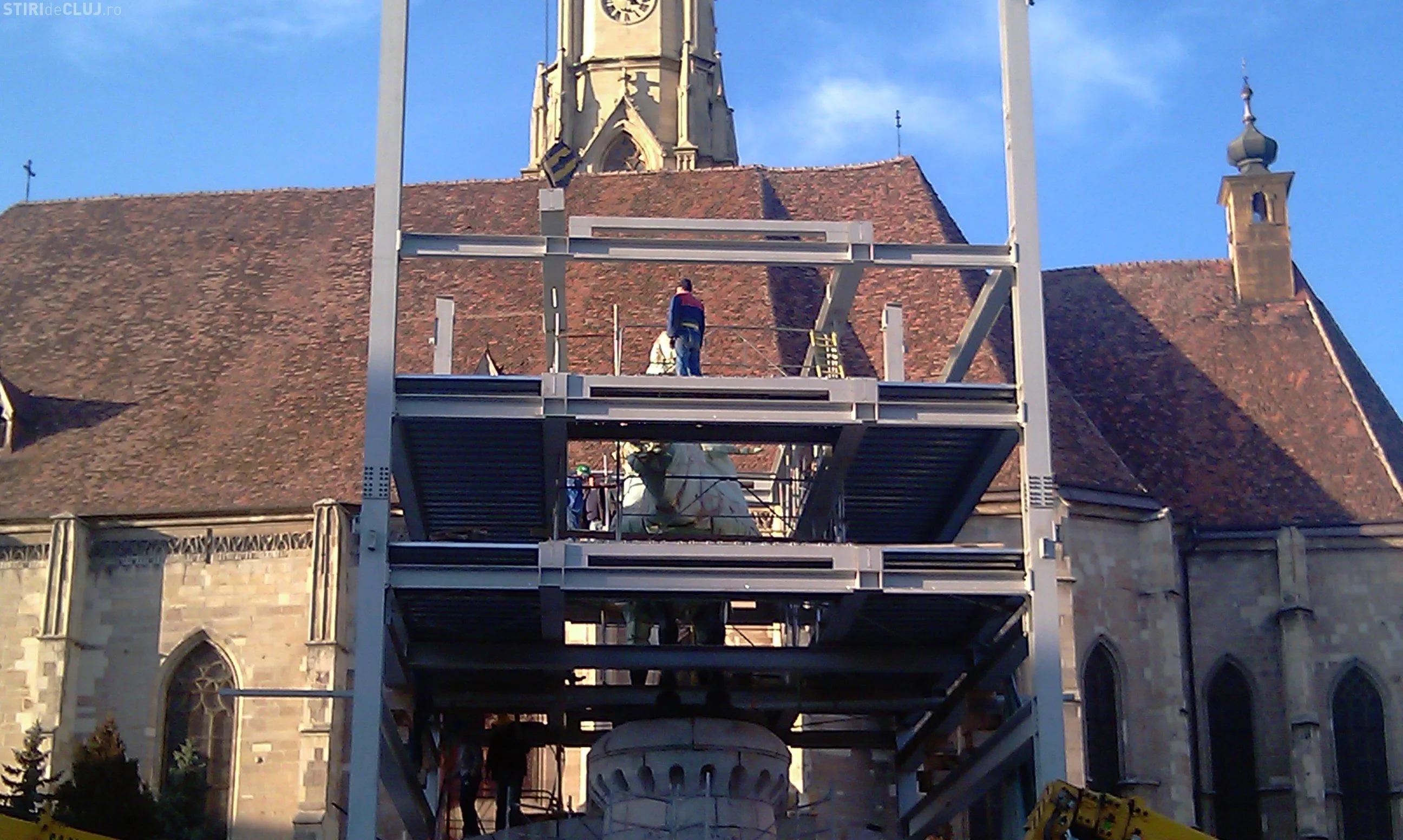 Structura metalica folosita pentru suspendarea in aer a statuii lui Matei Corvin este demontata. Specialistii in restaurare mai au de lucru la structura de piatra a monumentului.