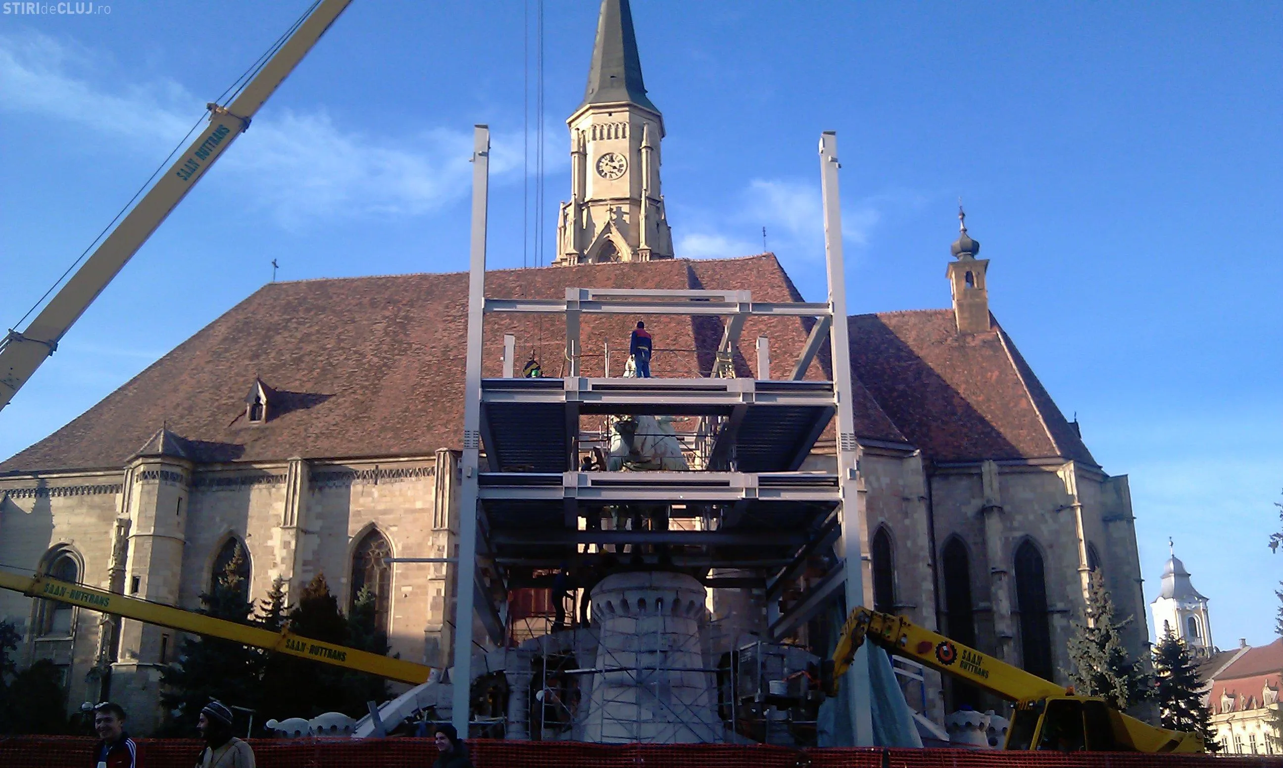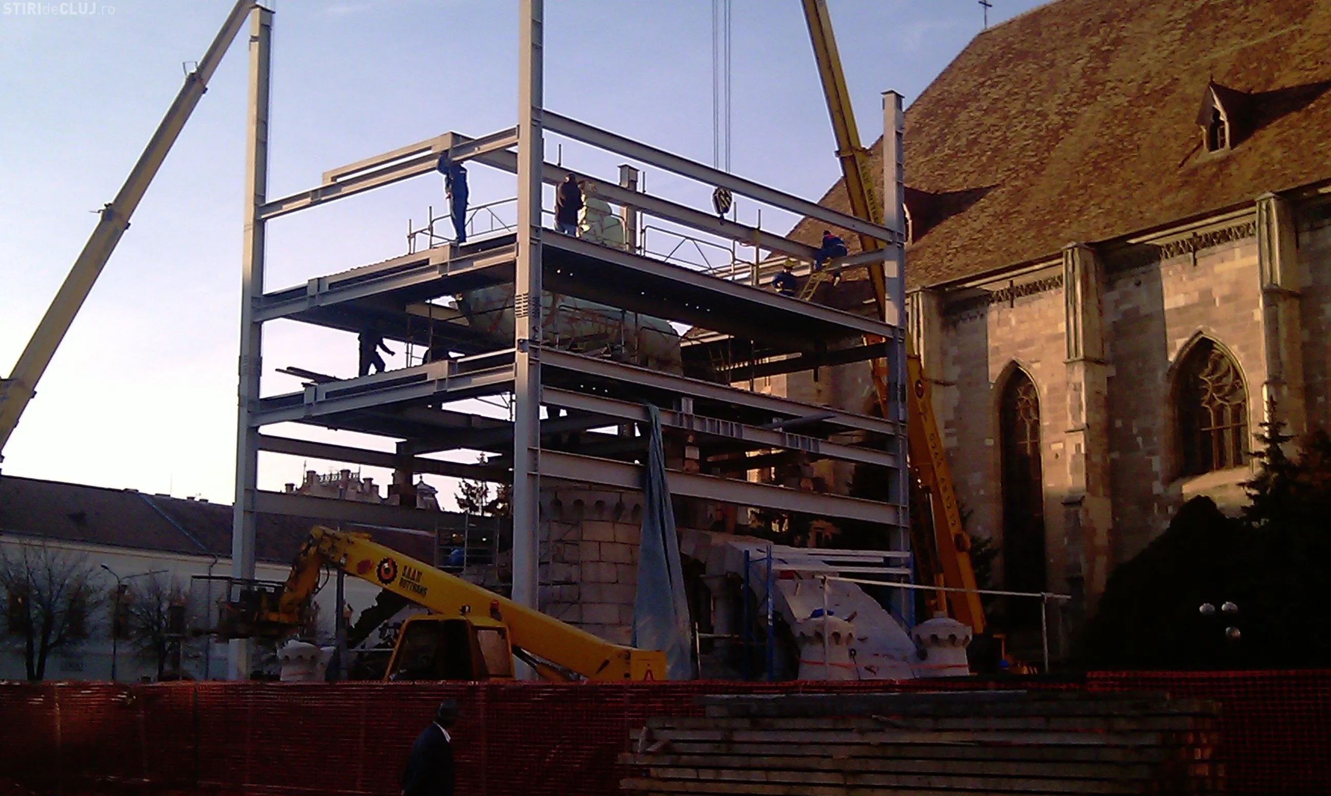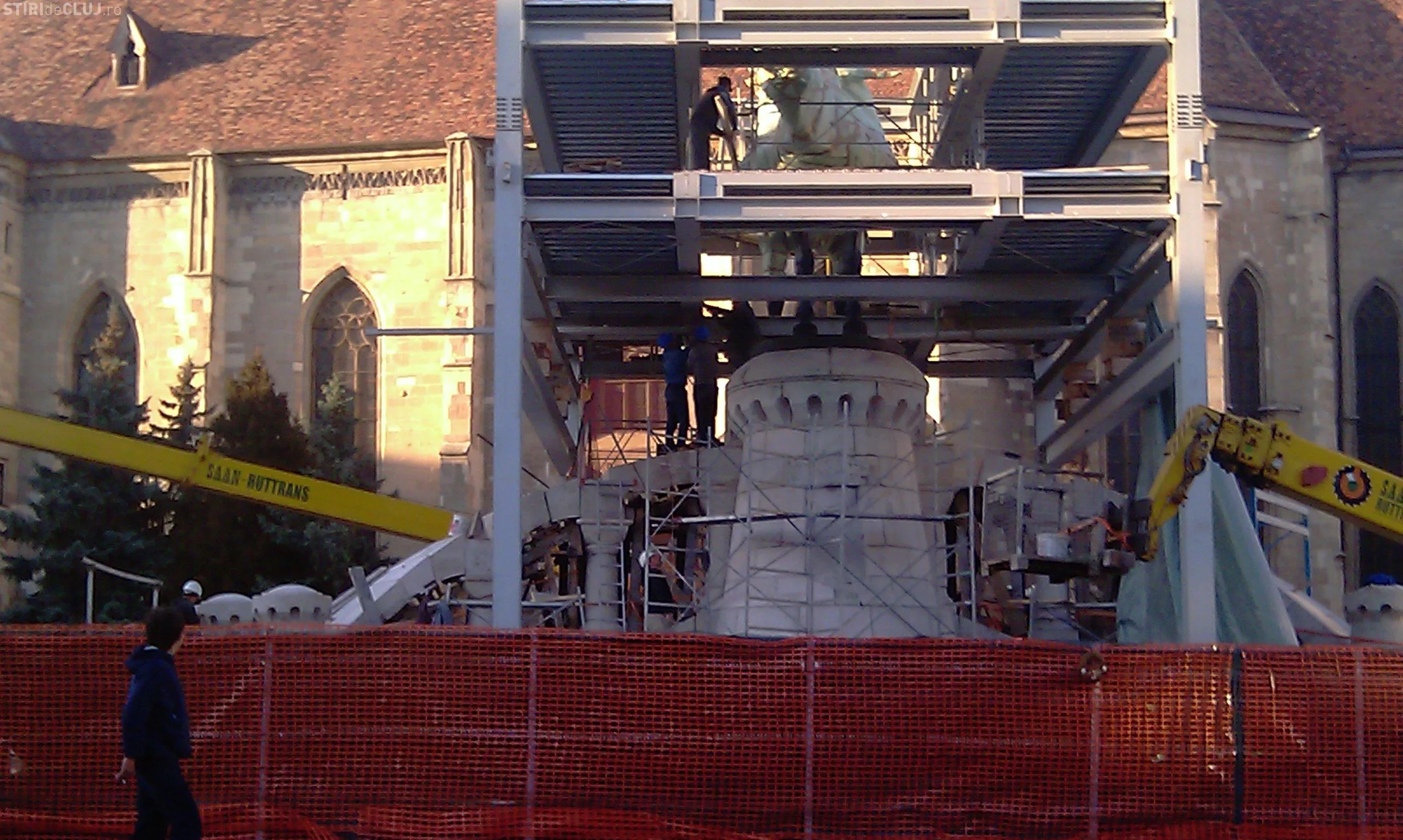 Structura metalica folosita pentru suspendarea in aer a statuii lui Matei Corvin este demontata. Specialistii in restaurare mai au de lucru la structura de piatra a monumentului.