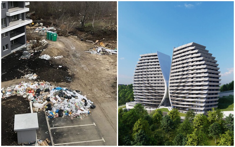 Constructorul ”blocului cu Aripi” de pe strada Frunzișului, milionarul Dorin Bob, este acuzat că promovează idei ”eco”, dar la blocul pe care îl ridică este plin de gunoaie.