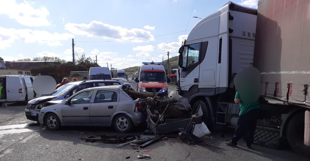Haos pe un drum din Cluj! Două mașini și un tir s-au făcut praf în urma unui accident rutier. O femeie a fost transportată la spital