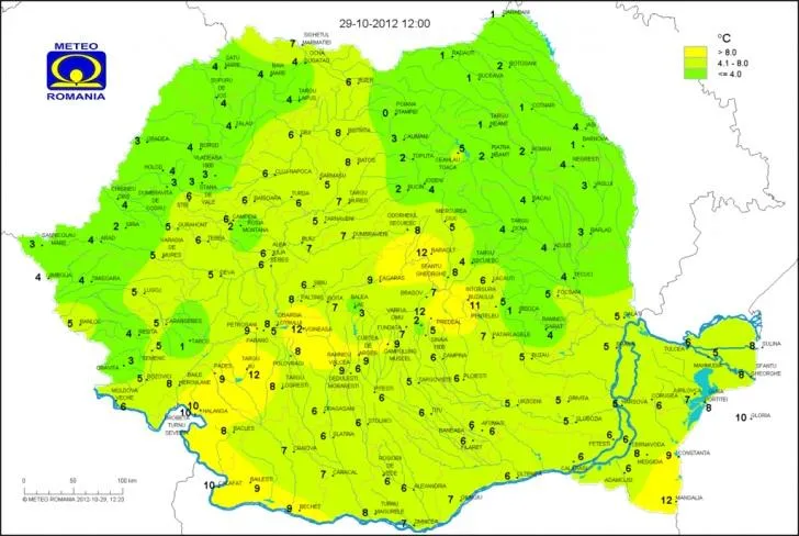 Temperaturile au scăzut cu circa 20 de grade Celsius în întreaga țară. Administrația Națională de Meteorologie a publicat o hartă cu cele mai scăzute temperaturi din România.