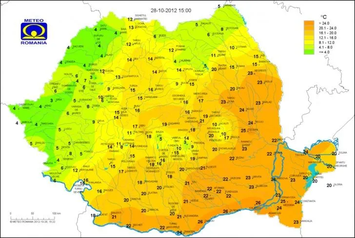 Temperaturile maxime vor fi cuprinse între 2 grade în Dealurile de Vest şi 12 grade pe litoral, iar cele minime se vor situa, în general, între -4 şi 6 grade. Noaptea, în zonele joase, vor fi condiţii de ceaţă.