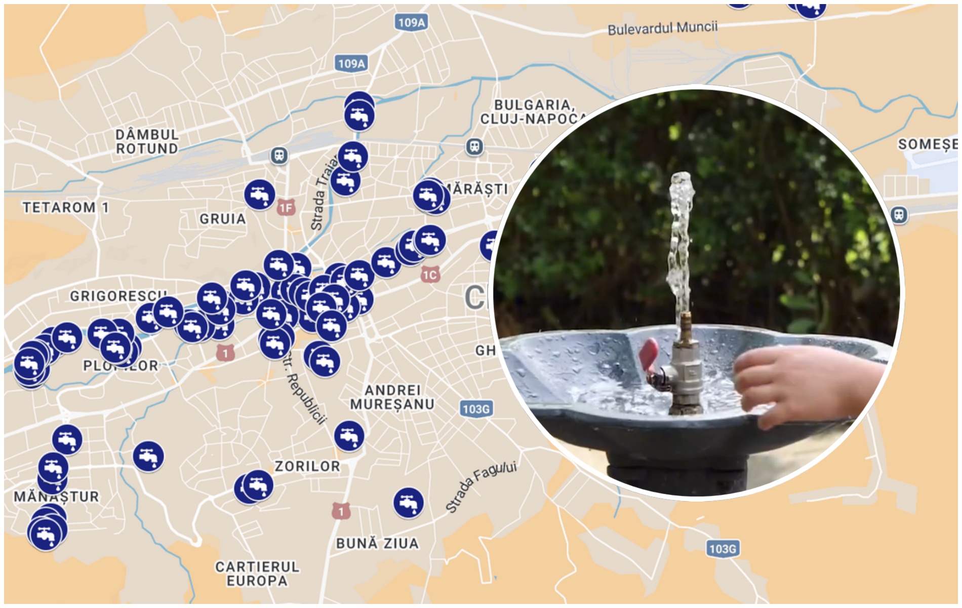 Harta cu cișmelele cu apă potabilă din Cluj-Napoca. Primăria Cluj-Napoca a amplasat peste 100 de astfel de instalații în tot orașul