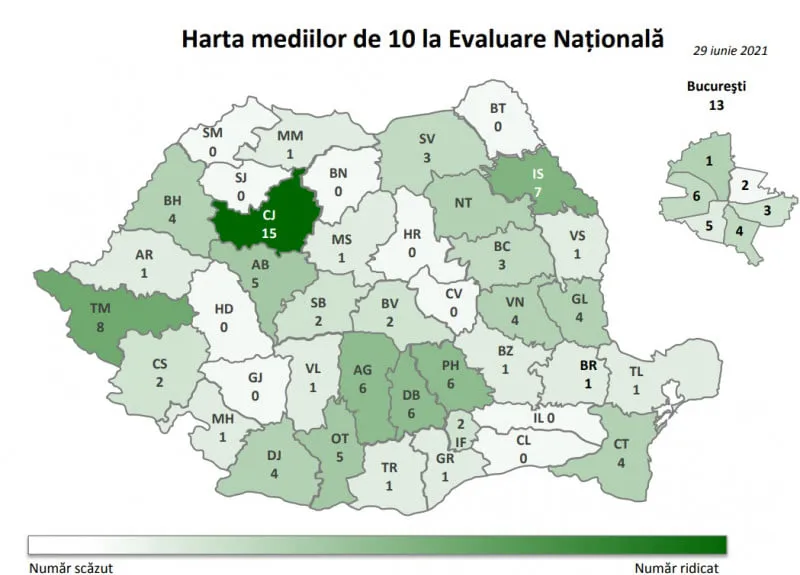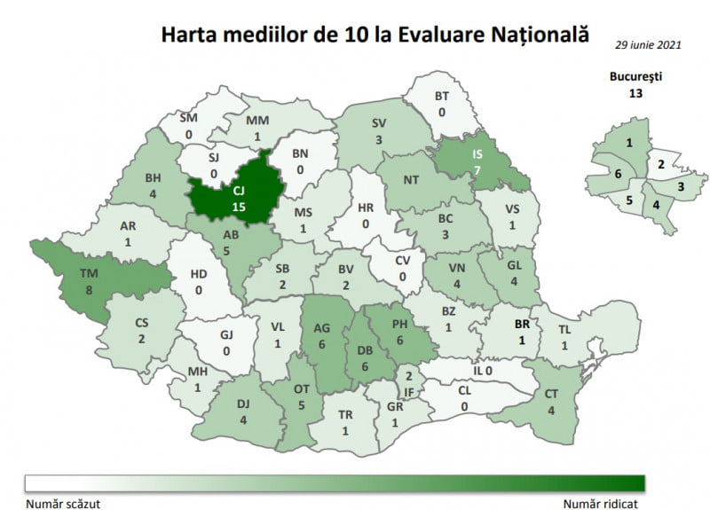 Potrivit datelor afișate, 15 elevi din județul Cluj, dintre care 13 elevi din municipiul Cluj-Napoca, au obținut media 10 la acest examen important pentru cei care au absolvit clasa a VIII-a. Și în acest an, Clujul se situează pe primul loc din țară privind rezultatele obținute la Evaluarea Națională. Clujul conduce în topul județelor, urmat de București cu 13 elevi, Timiș cu 8 elevi și Iași cu 7 elevi.